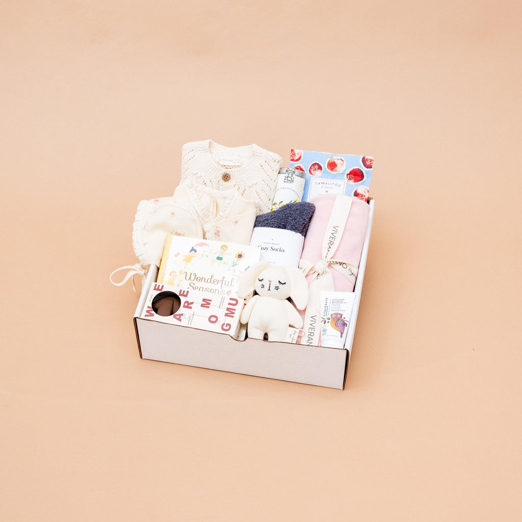 Inside every Little CouCou BabyBox you’ll find a thoughtfully curated mix of premium, eco-friendly baby essentials, plus a gift for the parent(s). Each pre-curated box is hand-packed with love and care and wrapped to perfection. We hand-write your notes on small kraft note cards.