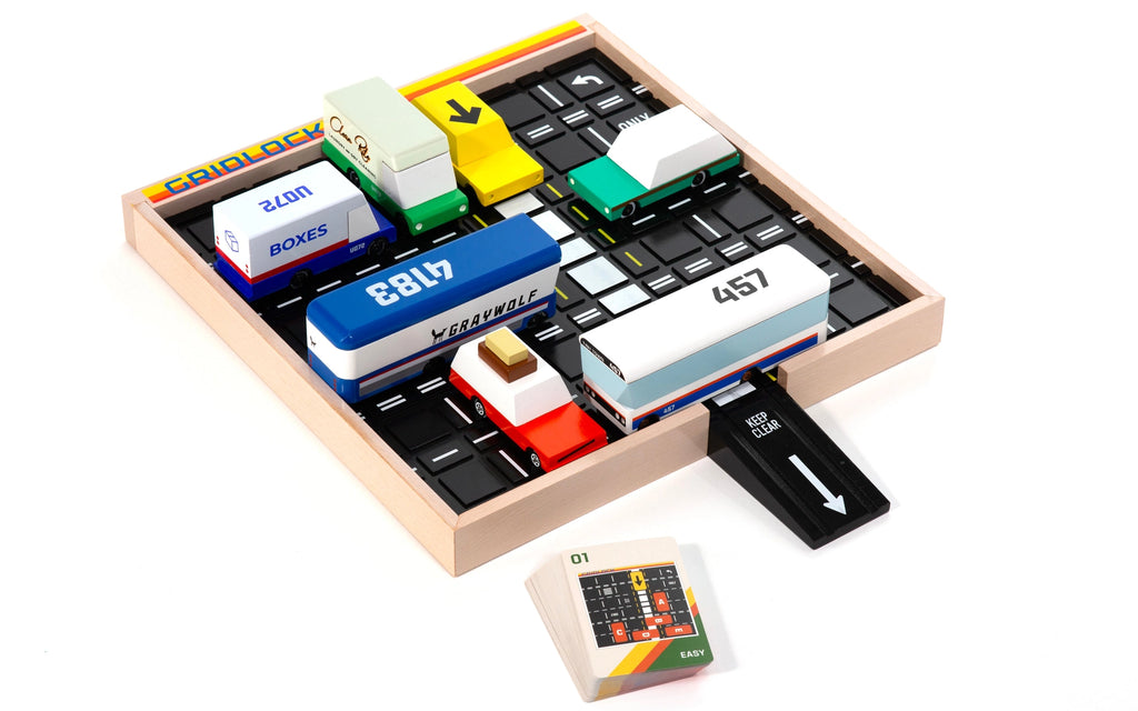 This fun puzzle game includes 40 cards with unique puzzles that put your Candylab Toy Collection to work! Ranging from easy to hard, these puzzles use your cars to create a tricky traffic jam that you need to escape with the included yellow arrow "Block"car.
