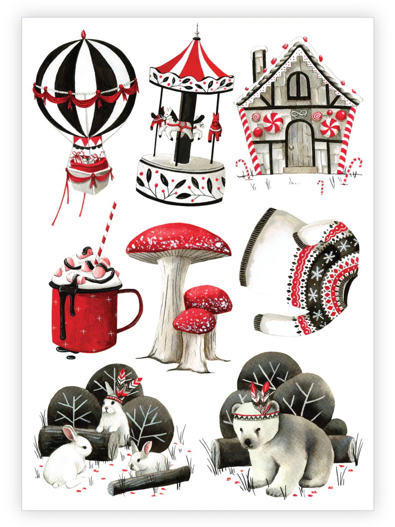 Hot air balloon, carousel, merry-go-round, Gingerbread house, coffee drink with marshmallows and milk, ugly sweater, boho rabbits, bohemian bunnies, bear cub with boho feather, mushrooms, fly agaric, amanita, candy, black ink.