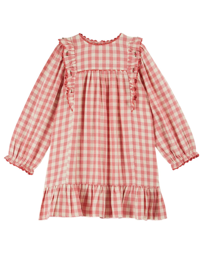 This Vichy gauze dress features delicate shoulder and bottom frills adorned with intricate embroideries. The crochet trim on the collar, frill, and sleeves brings a playful, handcrafted feel, Buttoned at back.