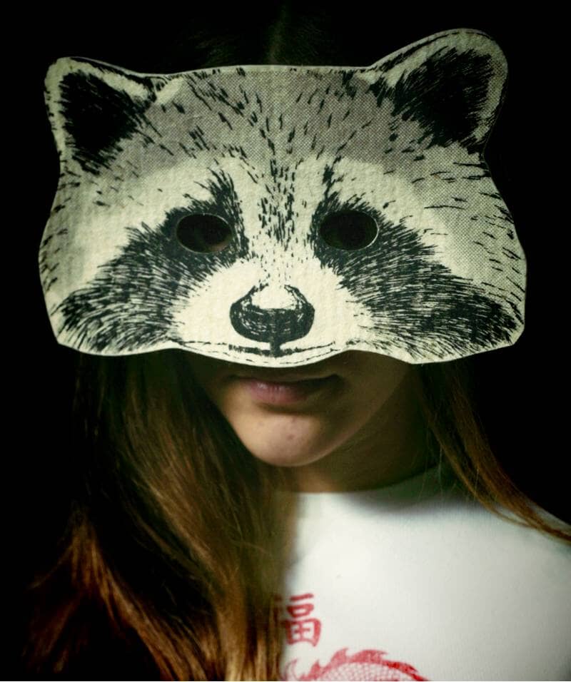 The Racoon mask, designed from an original illustration and carefully silk-screened by hand on pure wool felt, will accompany you in your most beautiful fantasies. Tie closure.
