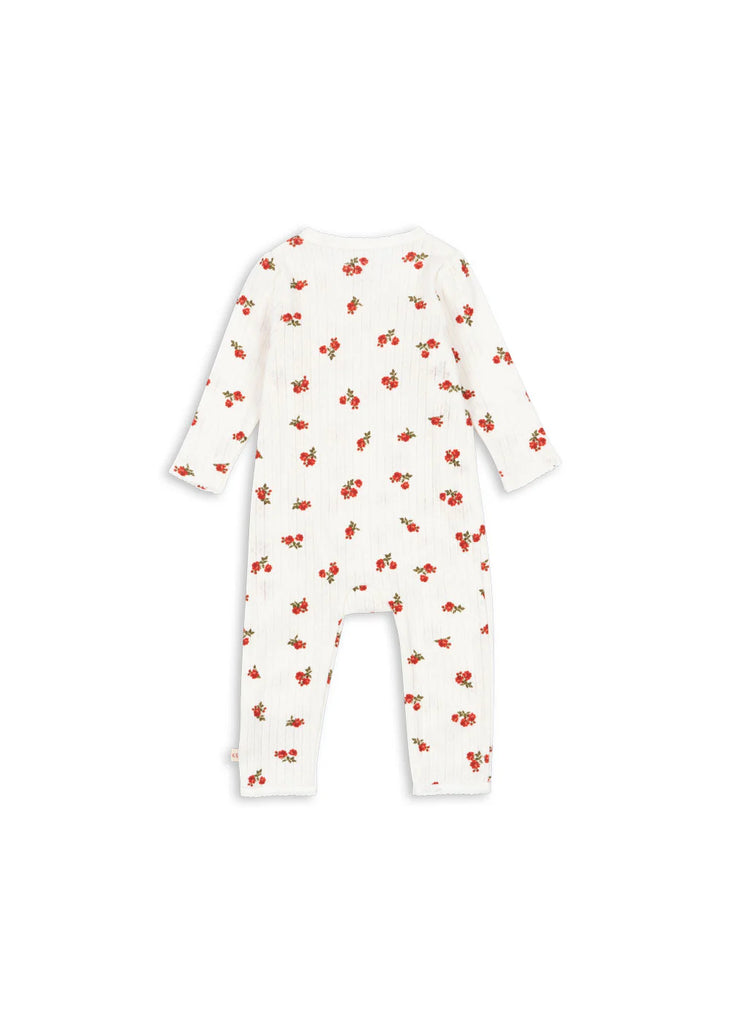 Soft onesie for newborns with a convenient wrap closure for easy dressing. Features snap buttons along the body and legs, and decorative pointelle pattern.