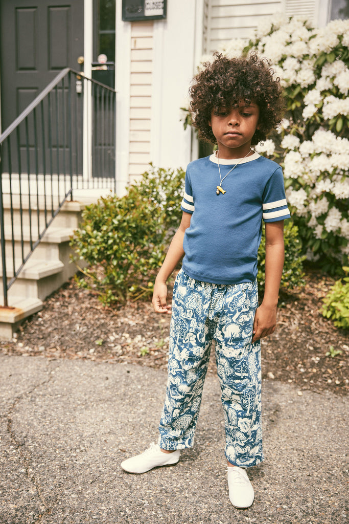A relaxed pull-on pant in a Pima cotton jersey, featuring a gathered elastic waistband, two patch pockets, and one back pocket.