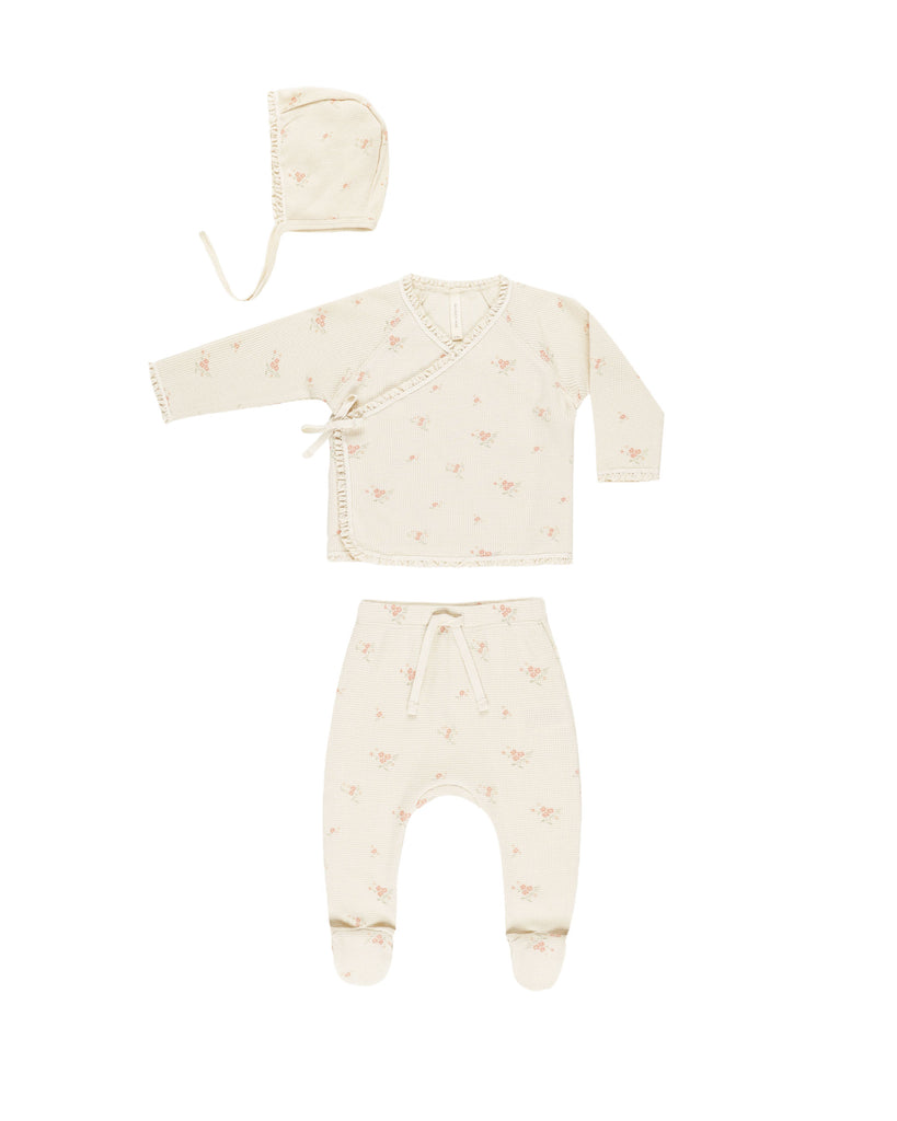 Soft kimono set with a long sleeve top made out of our organic cotton that ties on inside and outside for a comfortable fit and matching footed pants and bonnet.