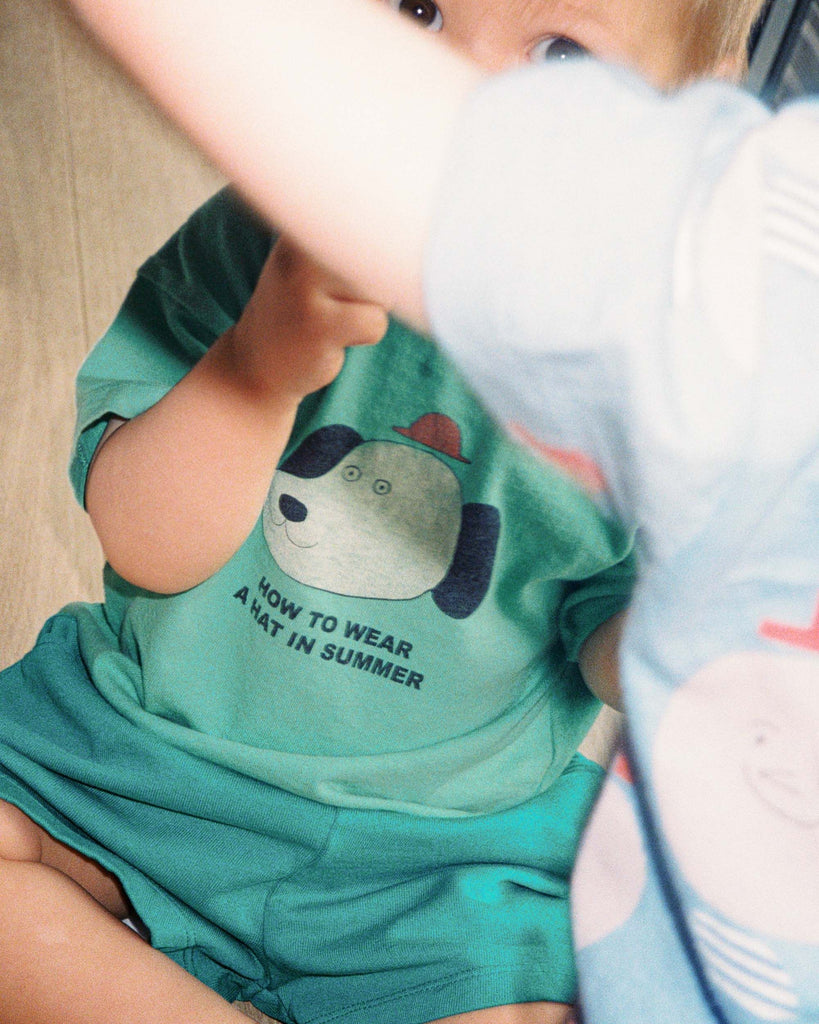 Short sleeve T-shirt in green featuring a playful print of a dog wearing a hat, Snap button on collar.