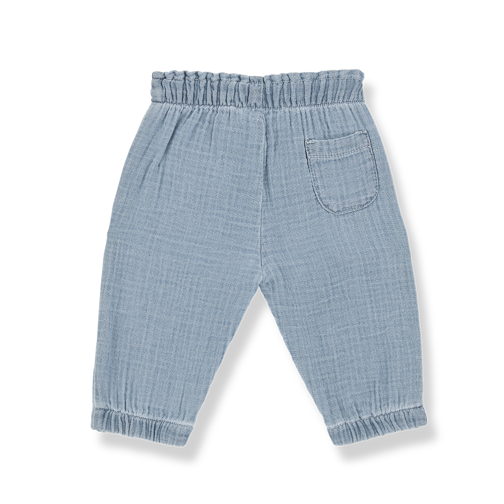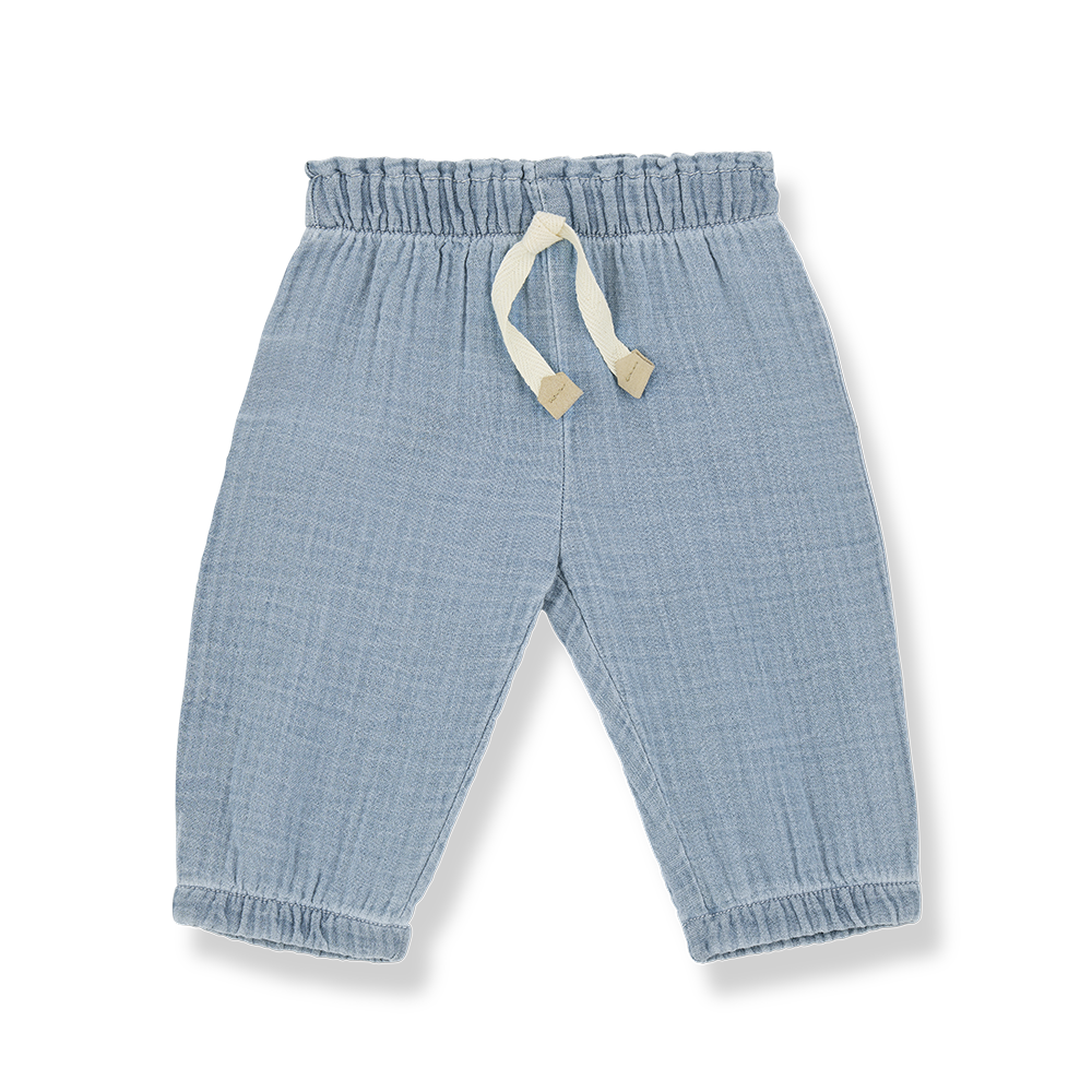 Ligh blue denim pants with elastic waist and cuffs. Decorative cotton twill tape with synthetic leather finish detail.
