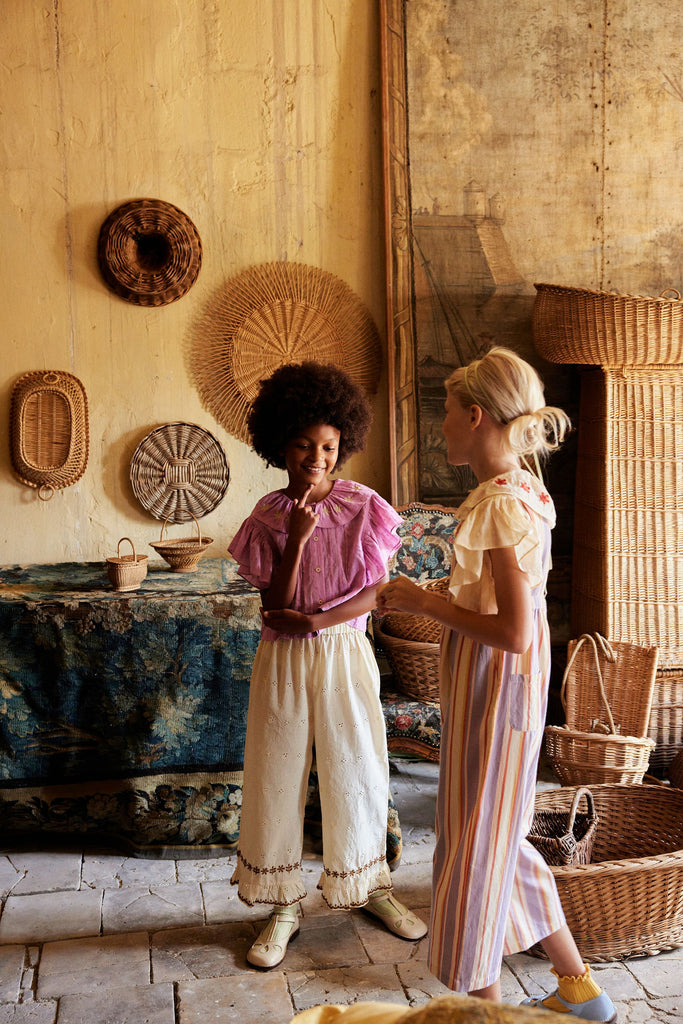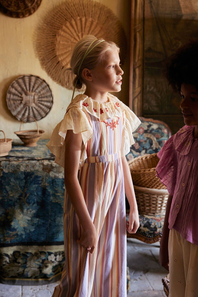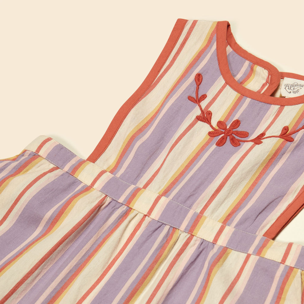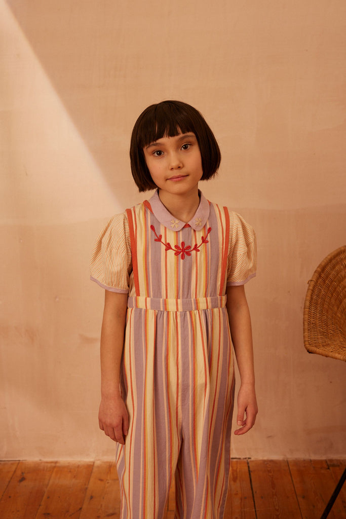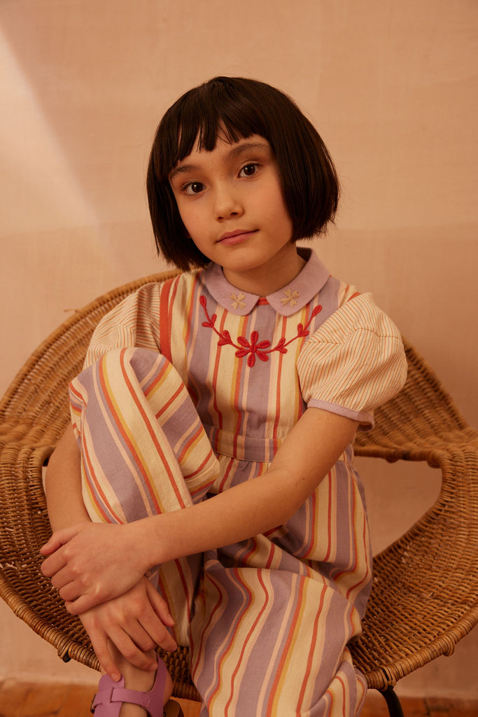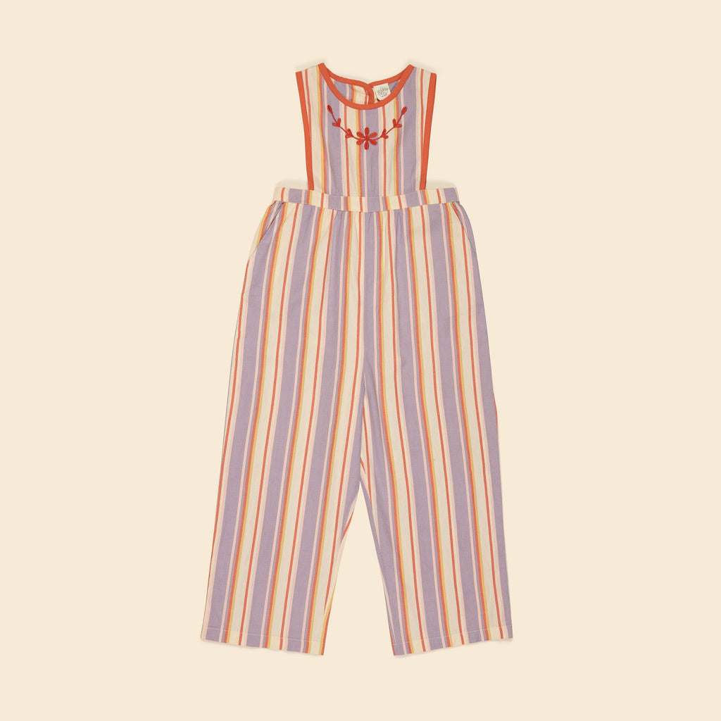 Our much-loved Bobbi dungaree returns in the season’s specially woven ‘Rustrel’ stripe. Bobbi’s wide leg shape, back pockets and layering potential make her a practical piece for summer adventures. Featuring Apolina’s signature floral embroidery at chest and a contrast binding finish in ‘poppy’. Back bib button closure with button and invisible zip at waist. We love Bobbi worn as is on warm days or layered with a favorite tee for a cool vintage vibe.