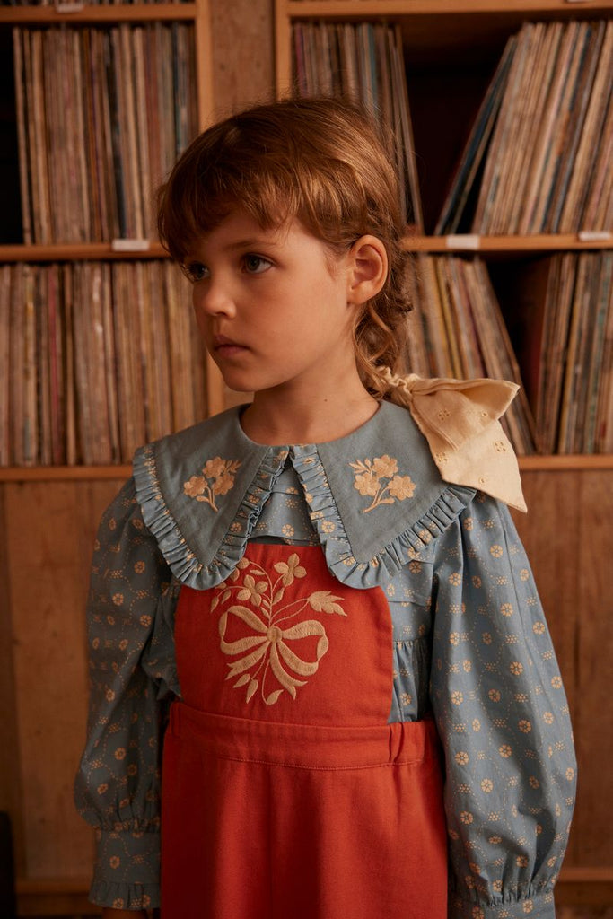 Dionne Blouse-Quilt Calico Blue Pebble. he vintage-inspired Dionne blouse is crafted in the season’s ‘quilt calico’ cotton. Featuring gently puffed sleeves with ruffle cuffs, and rows of pintucking at the chest that release to a sweet shape. Her statement frilled collar features Apolina’s signature contrast embroidery. Invisible zip closure at back. We love Dionne layered under pinafores or dungarees.