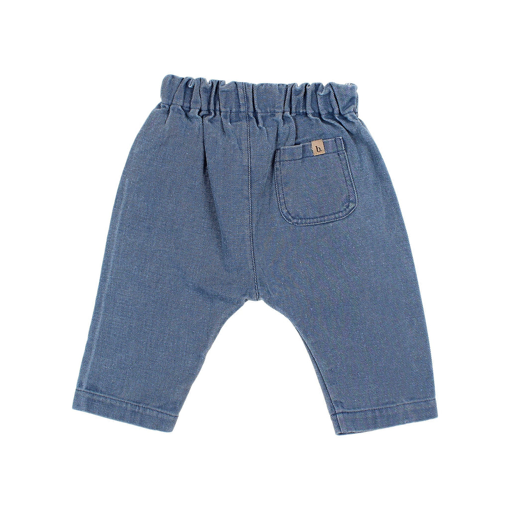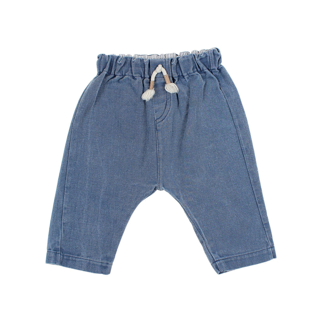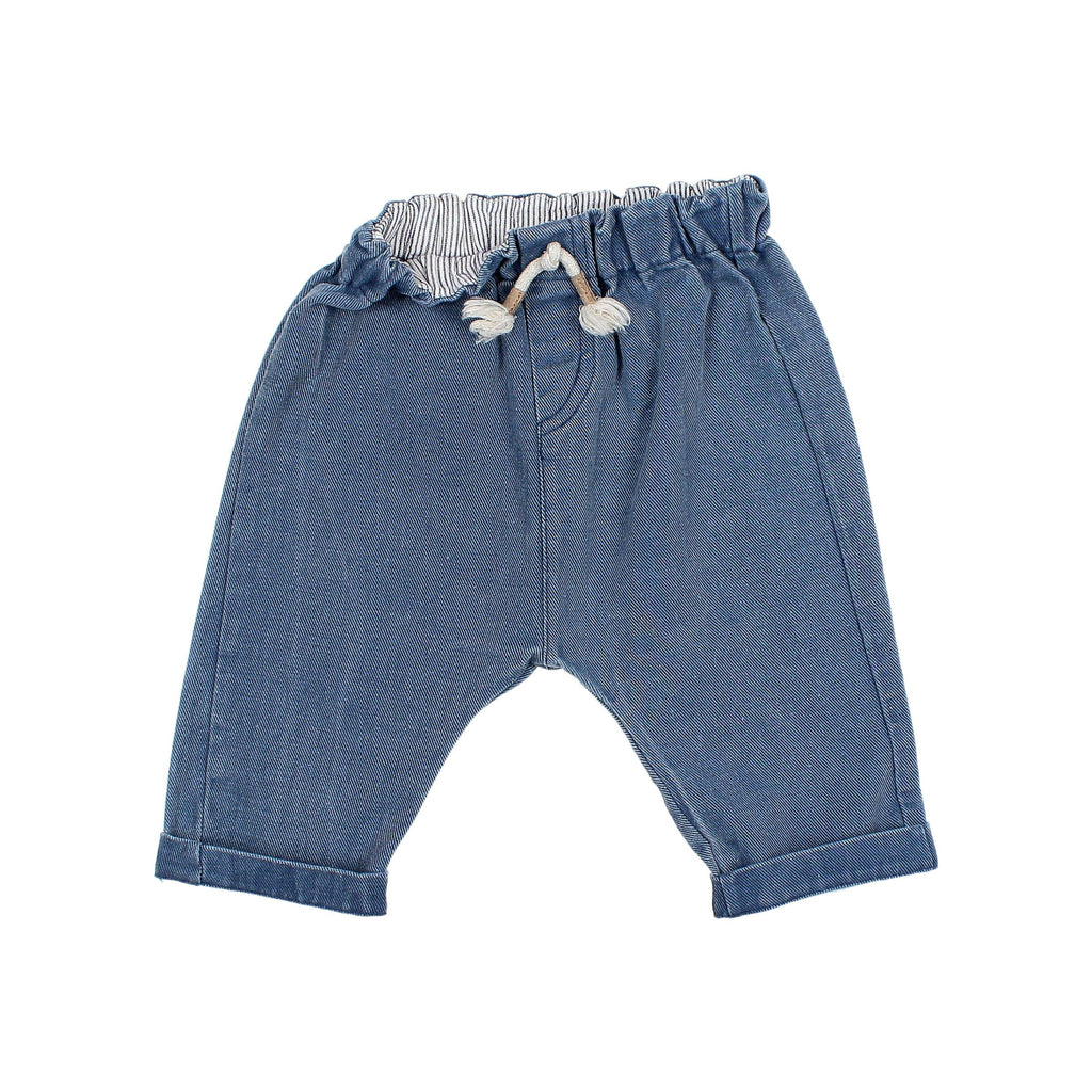 Washed denim pants with elastic waist and decorative drawstring. Back pocket.