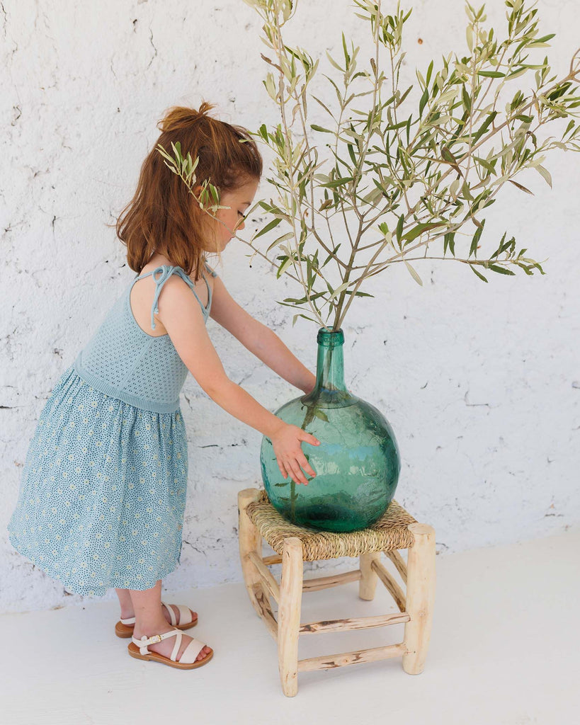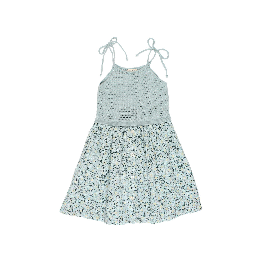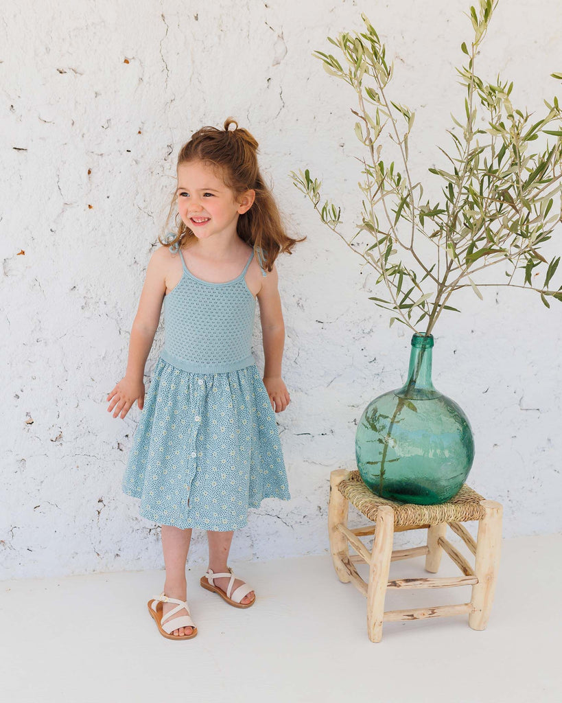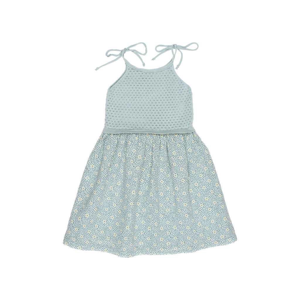 Combo dress with straps with bow. Tricot top and double-woven cotton bottom with flower print dots. Gathered waistband.