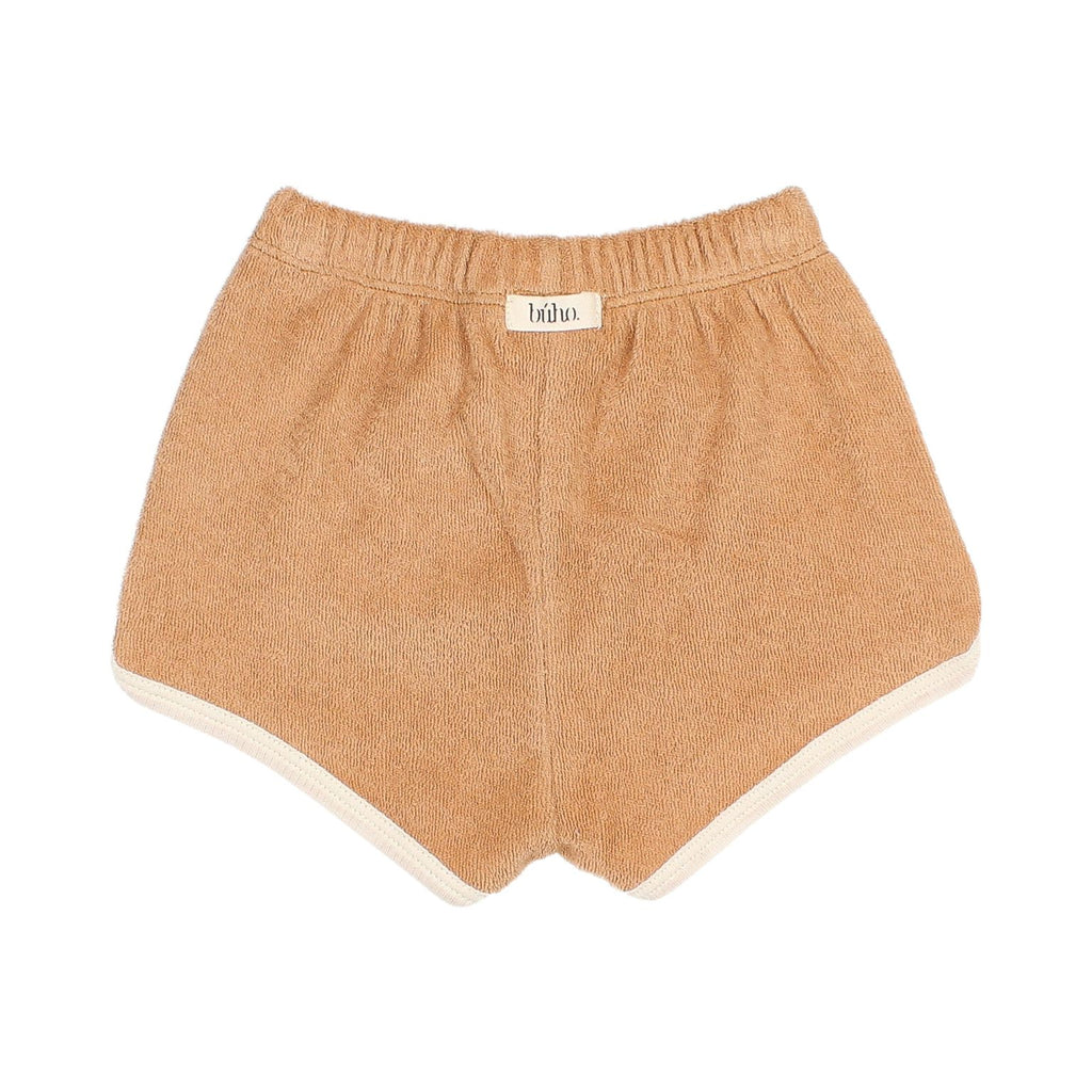Terry cloth shorts with elastic waistband, decorative tie and contrast trim.
