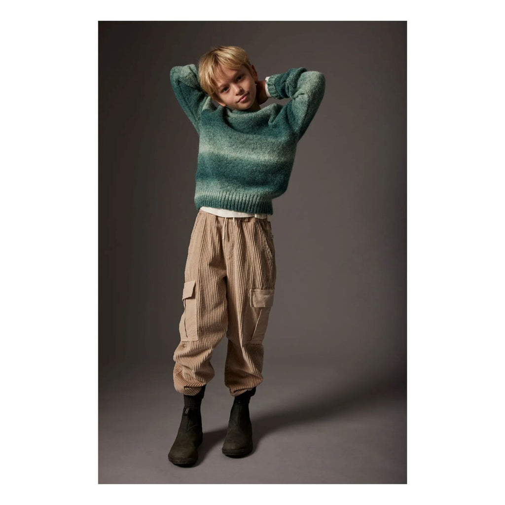 Wide corduroy cargo pants with adjustable braided drawstring, belt loops and side pockets. Contrasting cargo pockets.
