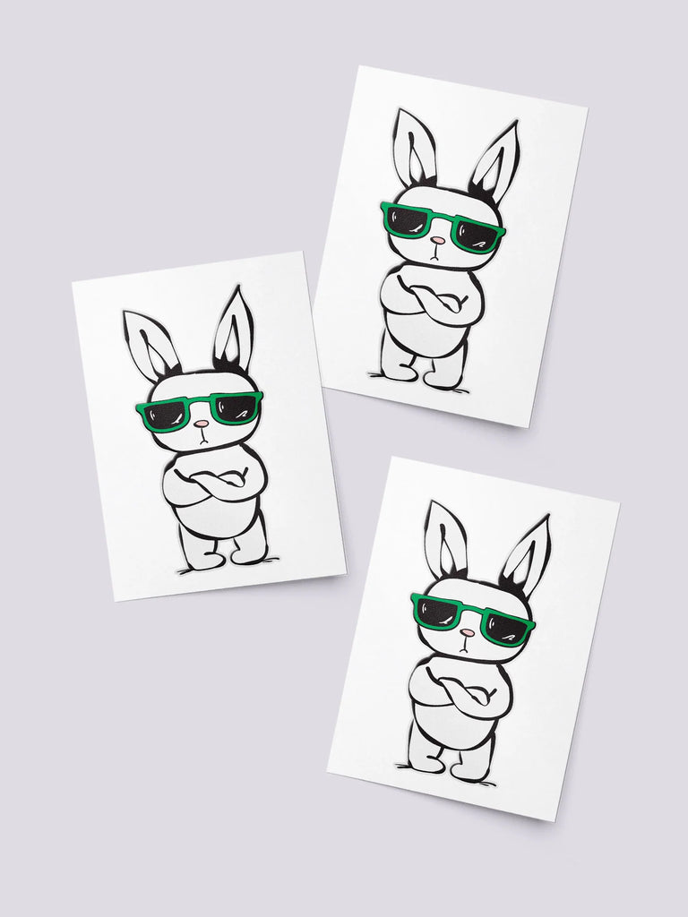 These cool temporary tattoos feature a rad white rabbit wearing some stylish sunshades! Perfect for kids who want to show off their style and have a bit of fun!
