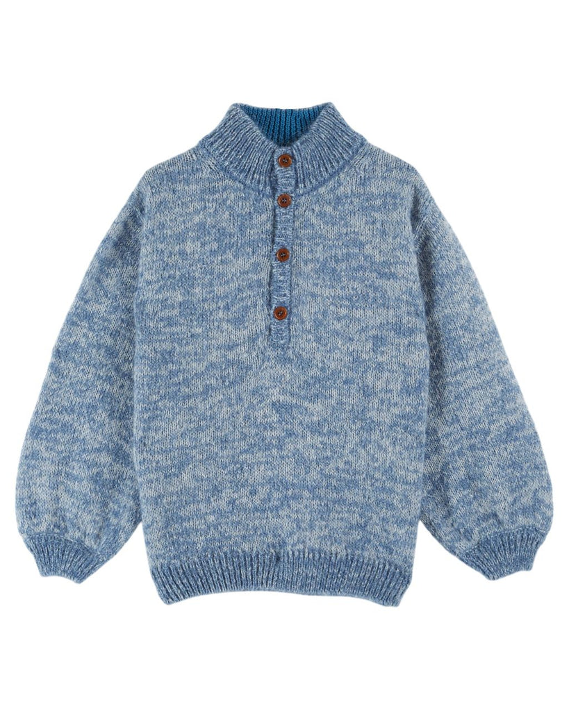 Loose fit "truck driver" sweater in white and blue sheep's wool blend. Round neckline, funnel neck with button opening. Long, wide sleeves.