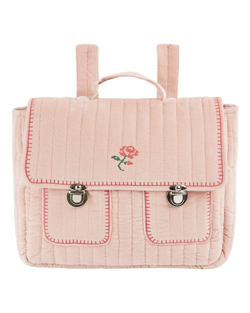 Light pink cotton velvet schoolbag with rose embroidered in cross-stitch on flap. Two patch flower pockets and flap with metal buckles. One handle and two adjustable straps.