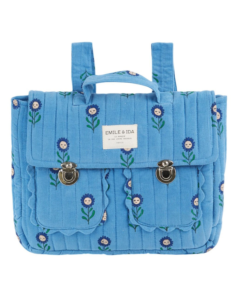 Blue cotton velvet schoolbag with dark blue all-over daisies. Two patch flower pockets and flap with metal buckles. One handle and two adjustable straps. Lined in ecru cotton voile.