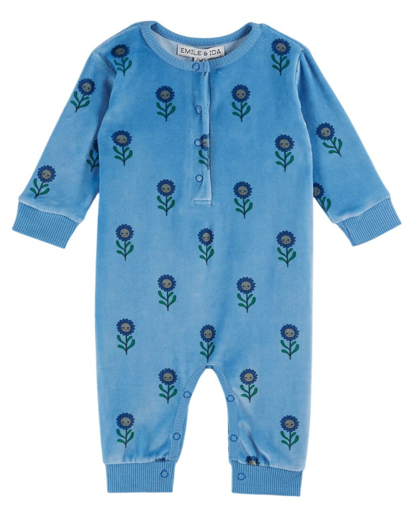 Velour jumpsuit in royal blue color with all-over flower print. Has front buttons closure and snaps between the legs for easy changing.