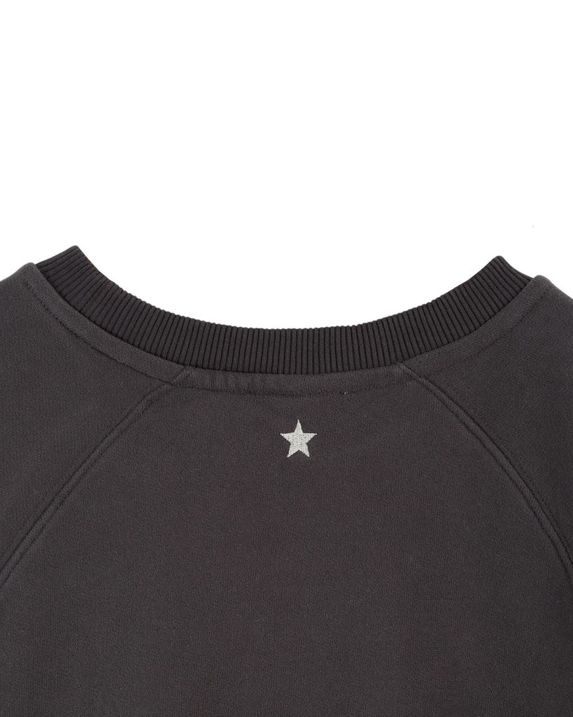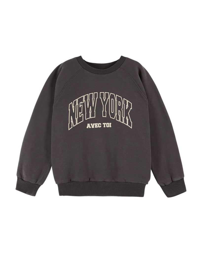 Sweatshirt in black organic cotton jersey. A sweatshirt that looks just like our sweaters: long raglan sleeves, round neckline, ribbing at the cuffs, around the neckline and at the hem and, of course, soft fabric. Then there's the print NEW YORK, AVEC TOI printed on the front.