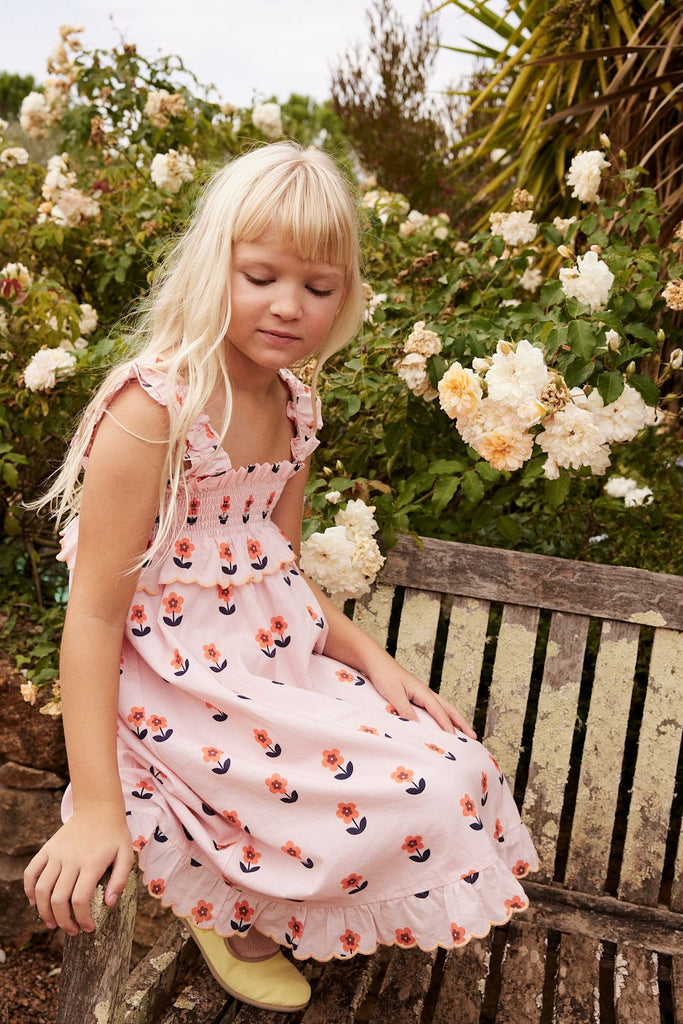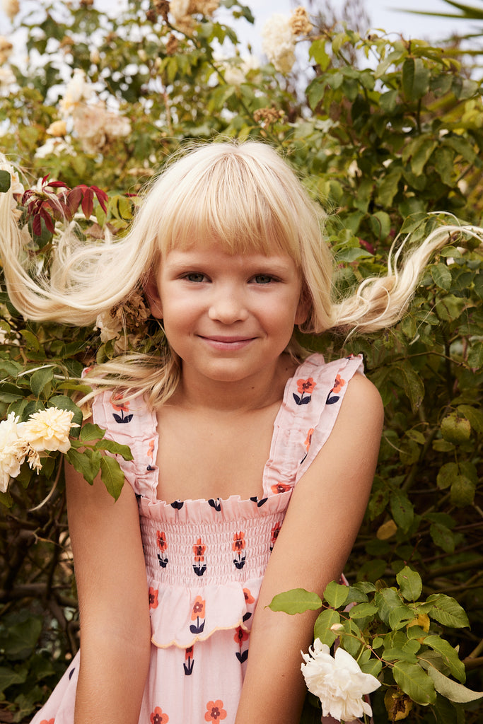 Long voile strappy dress in all-over print with elastics and ruffles on straps. Elasticated smocks at yoke with little ruffle on top. Flying below yoke and at bottom with scallops.