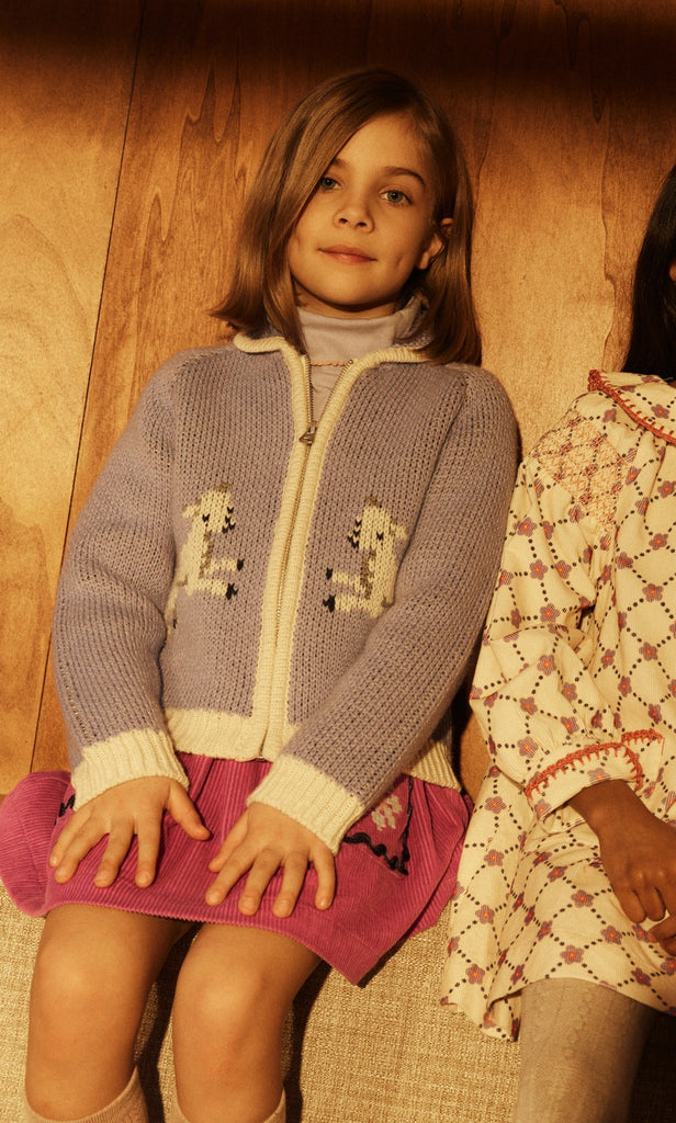 Knit cardigan with front zip and placed motif. Short fit, raglan armholes. Large, rounded collar. Contrast around collar, bottom of sleeve, bottom of body and around zip.
