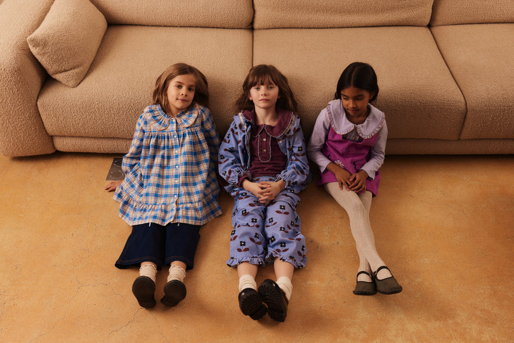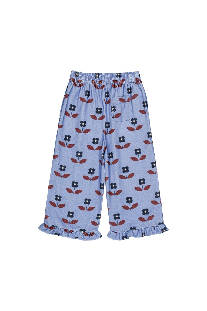 Printed baby corduroy pants, elasticated waistband, two side pockets, one patch pocket in back. Wide leg, small flounce at bottom of leg.