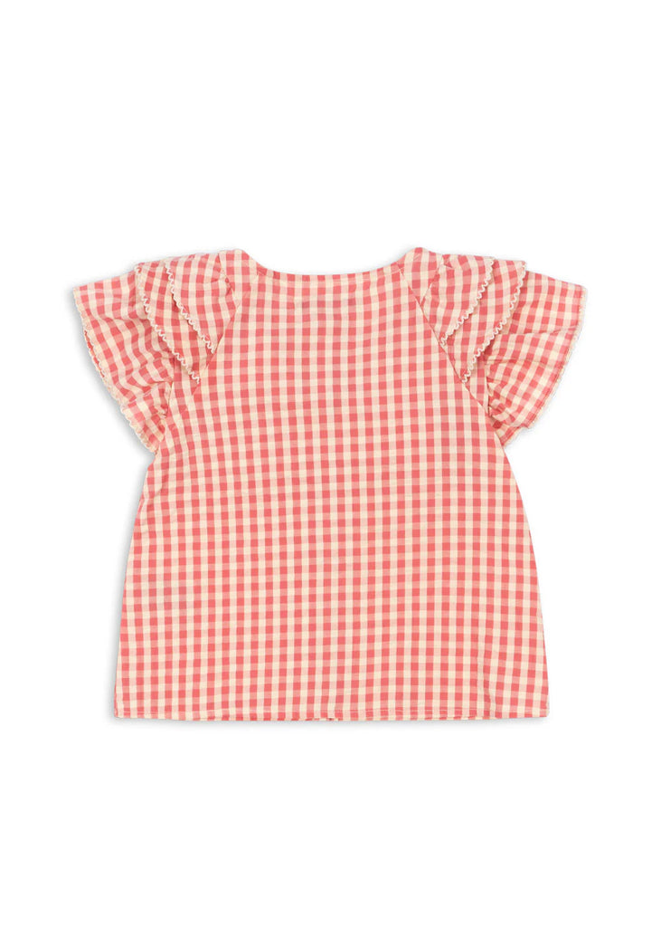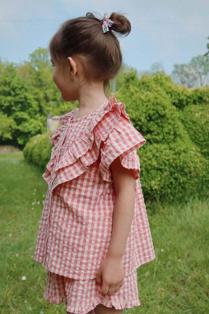 Blouse with frills in a soft seersucker fabric. Front buttoned.