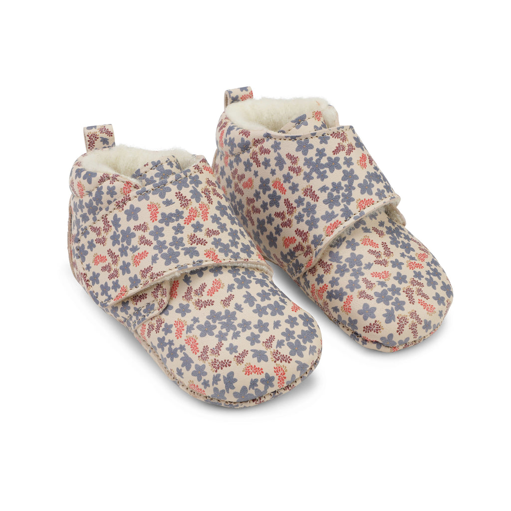 A perfect companion for cold winter to keep tiny toes warm and snug. The perfect little shoe to wear in the house or in the stroller or car seat. We love the removable padded suede and printed leather insole with natural crepe rubber. They are ergonomically shaped for the feet of growing children. The sole is slightly flexible and the velcro straps make sure that the feet are safely wrapped.