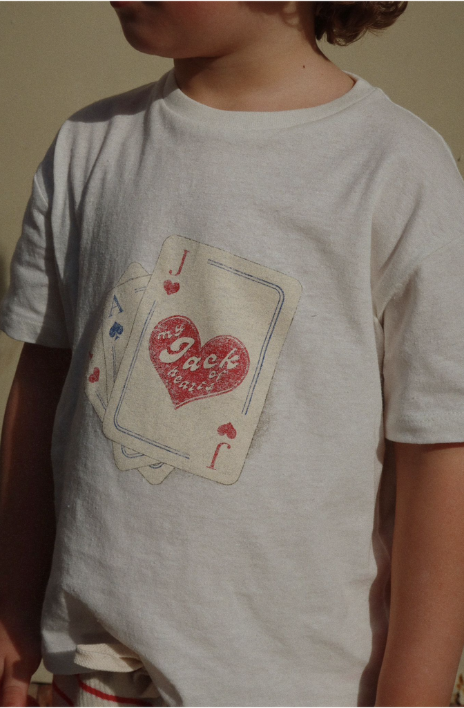 Designed with dropped shoulders, short sleeves, classic crewneck, and finished with a cute 'Jack of Hearts' print in front dedicated to Rosie's son.