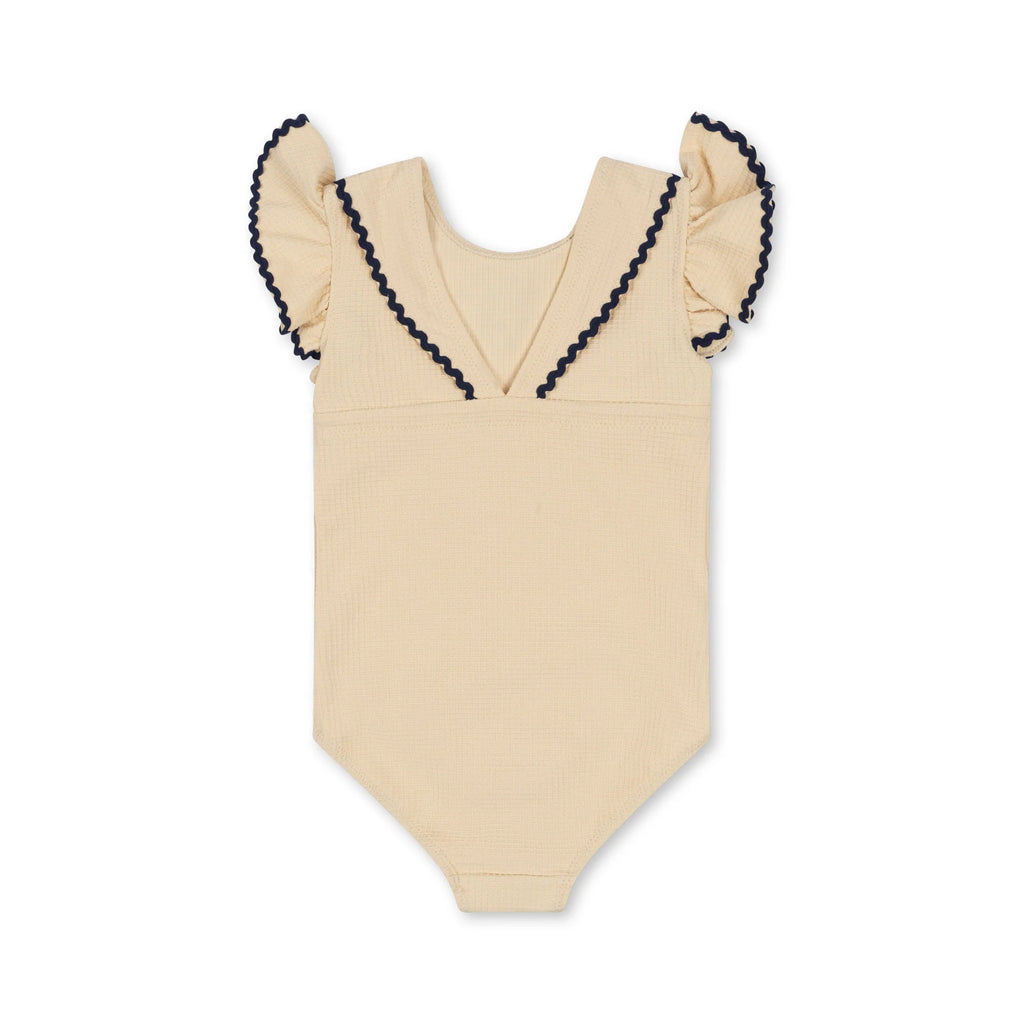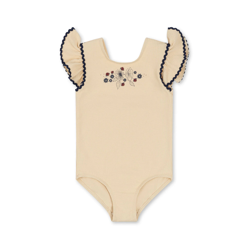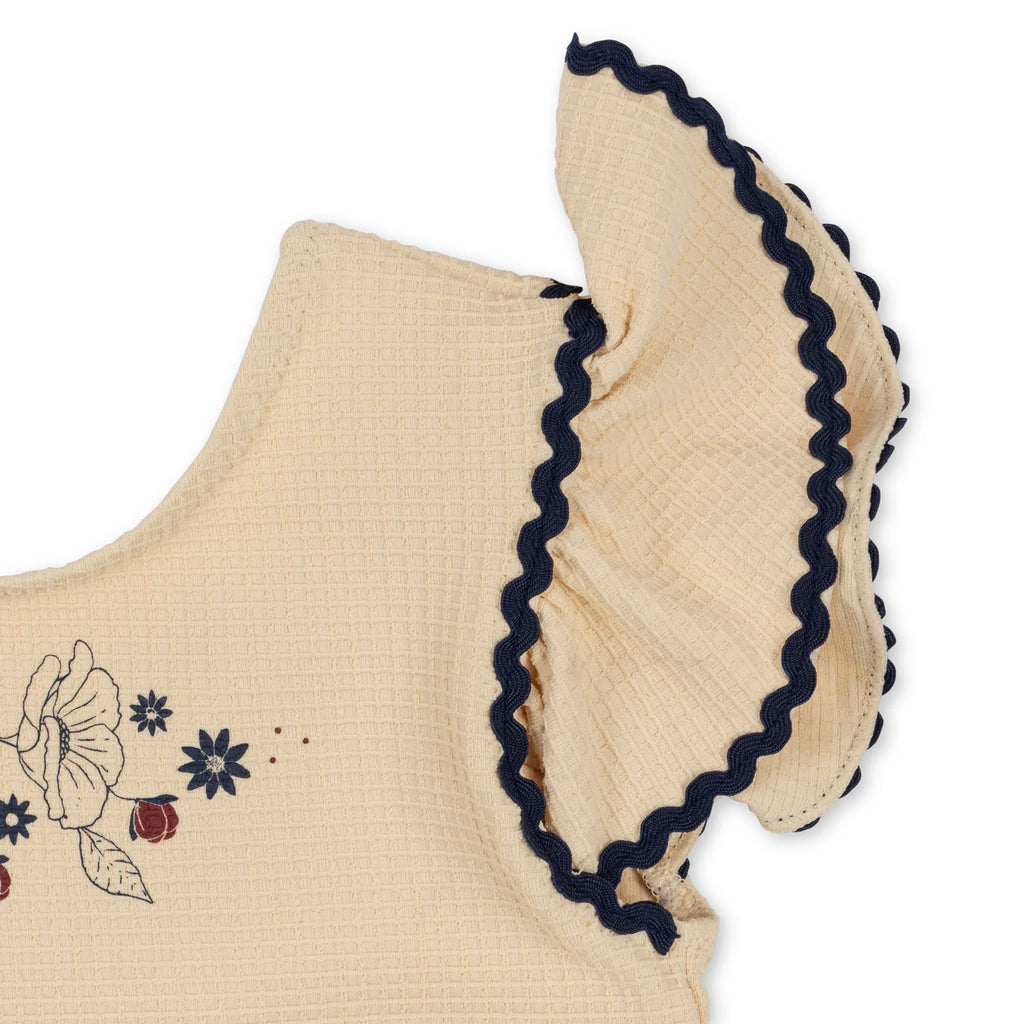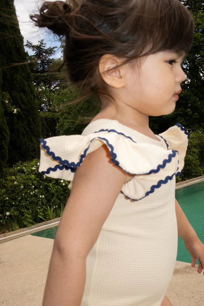 One-piece swimsuit with ruffle puffs and contrasting waving trim edges. Graphic printed at front.