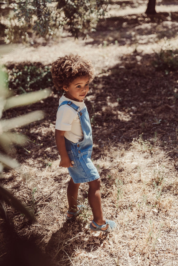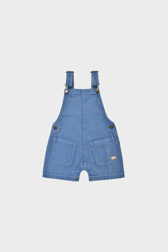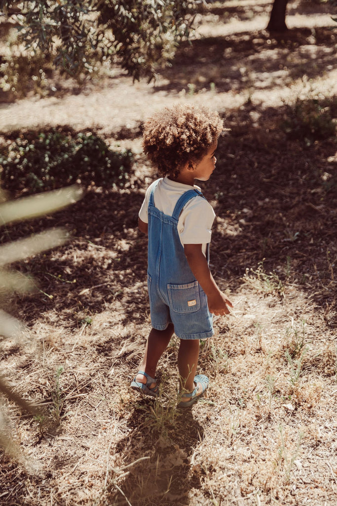 Denim-style overalls in soft cotton canvas. Contrasted tops stitching and adjustable straps with metal buckles. Buttons on the side. Front patch pockets and two back patch pockets, one with “LM” woven label.