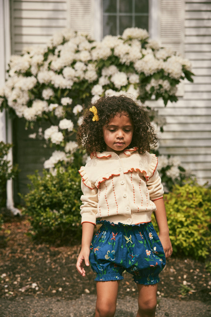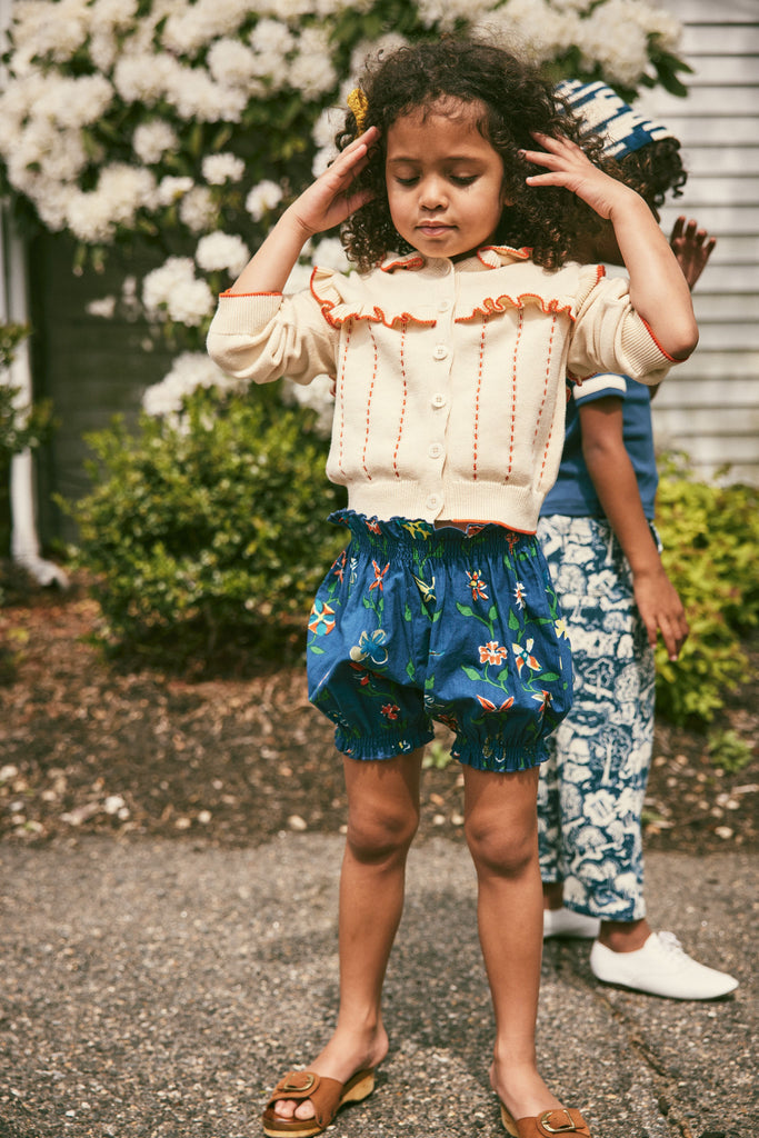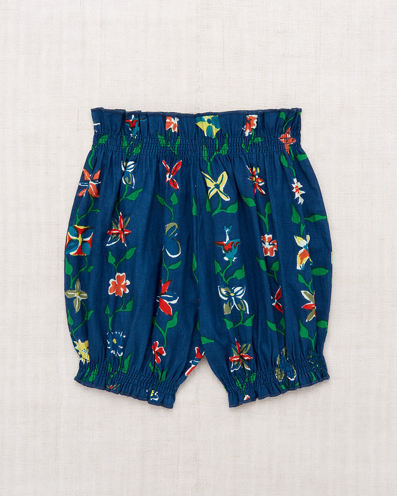 A pull-on bloomer in cotton poplin, with a cinched ruffle elastic waist and leg opening with a merrowed edge. Finished with French seams.