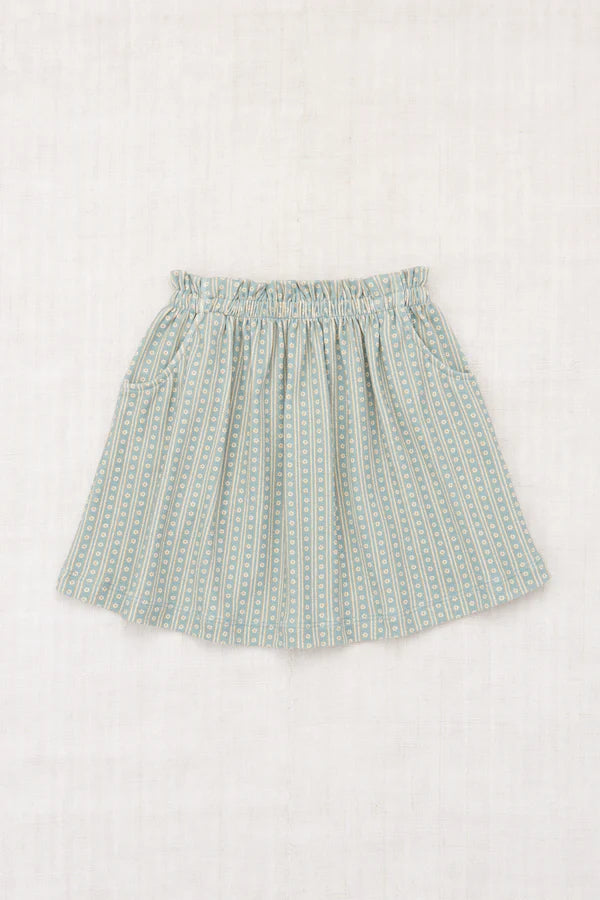 A pull-on skirt in organic Pima cotton, featuring a short, flowy silhouette, cinched ruffle elastic waistband, and two front pockets.