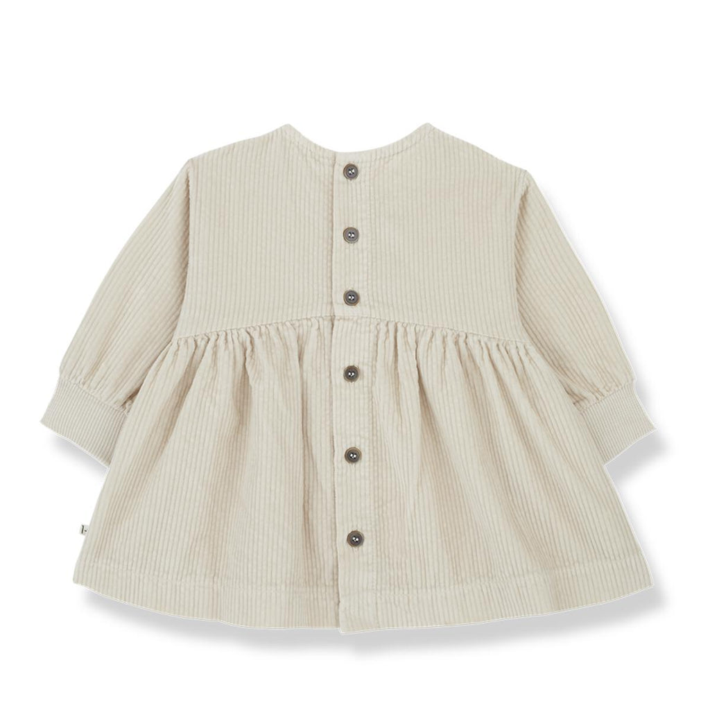 Long sleeve corduroy dress buttoned at back.