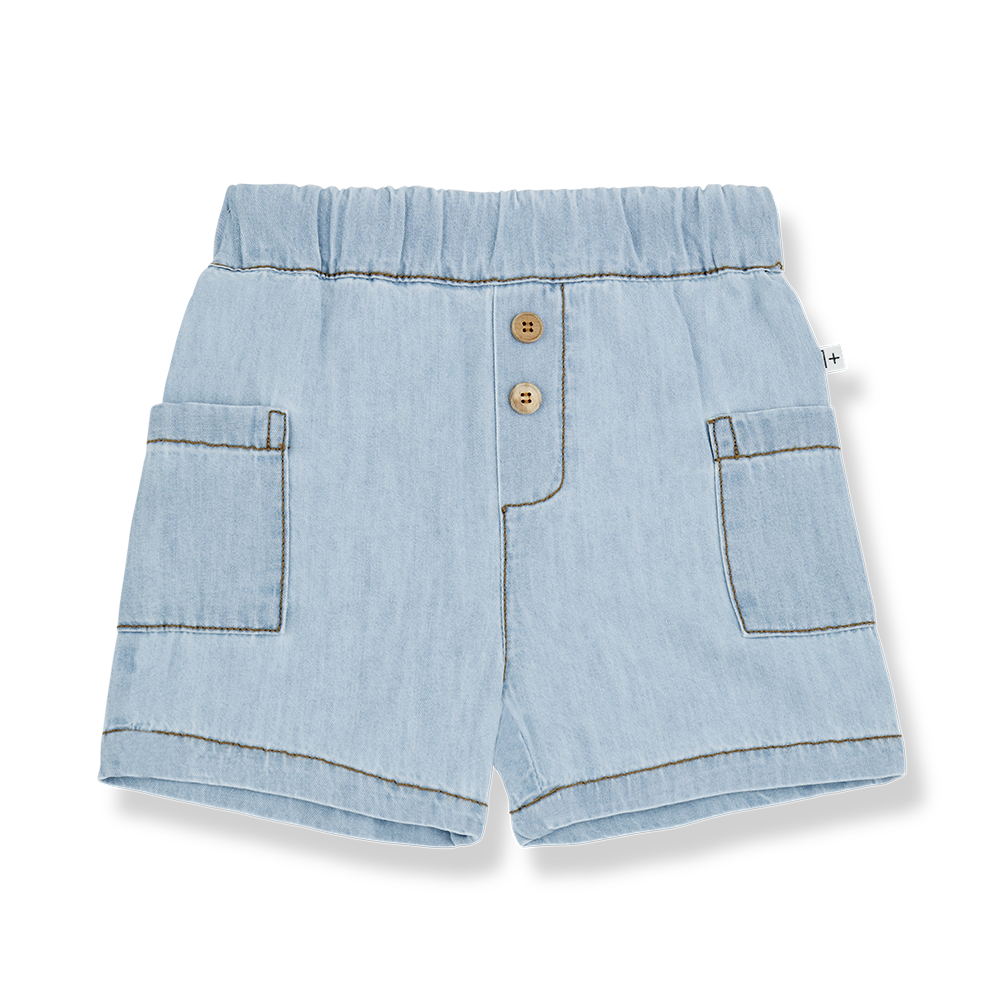 Bermuda denim shorts, featuring elastic waistband with decorative wood buttons on front. Big patch pockets on sides.