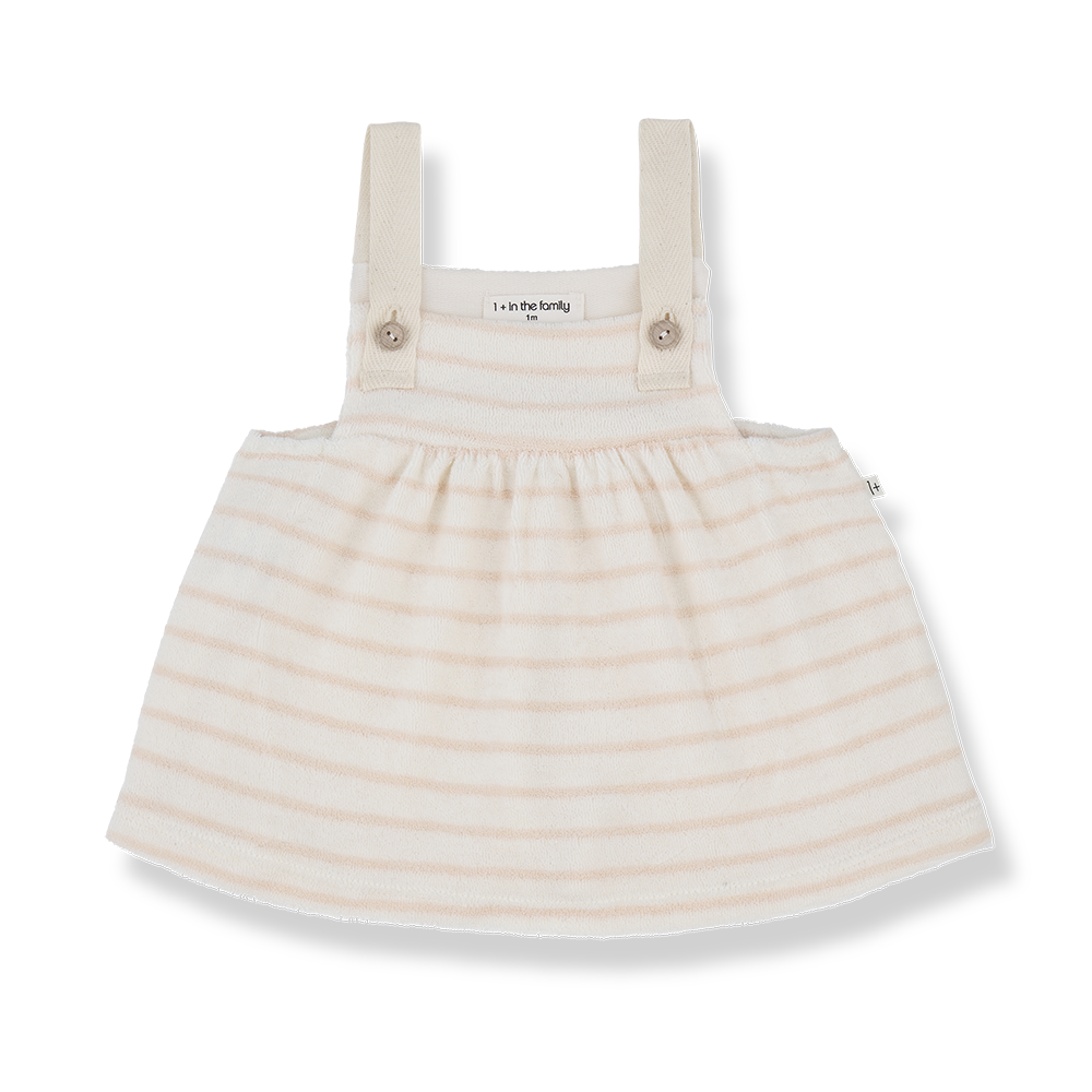 Two pieces in one: dress + bloomer. Elastic chest and back and cotton straps with wood buttons. The bloomer has an elastic waist and thights.