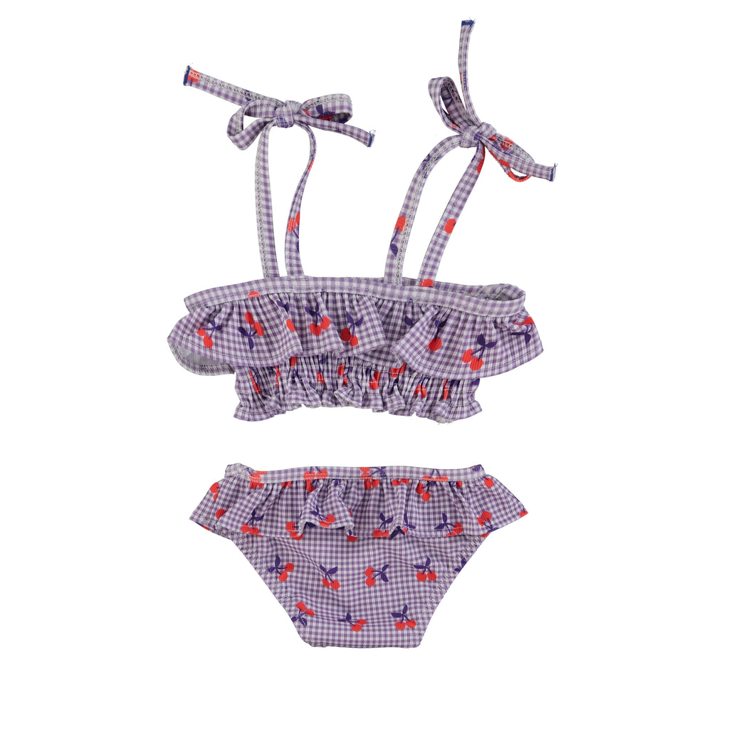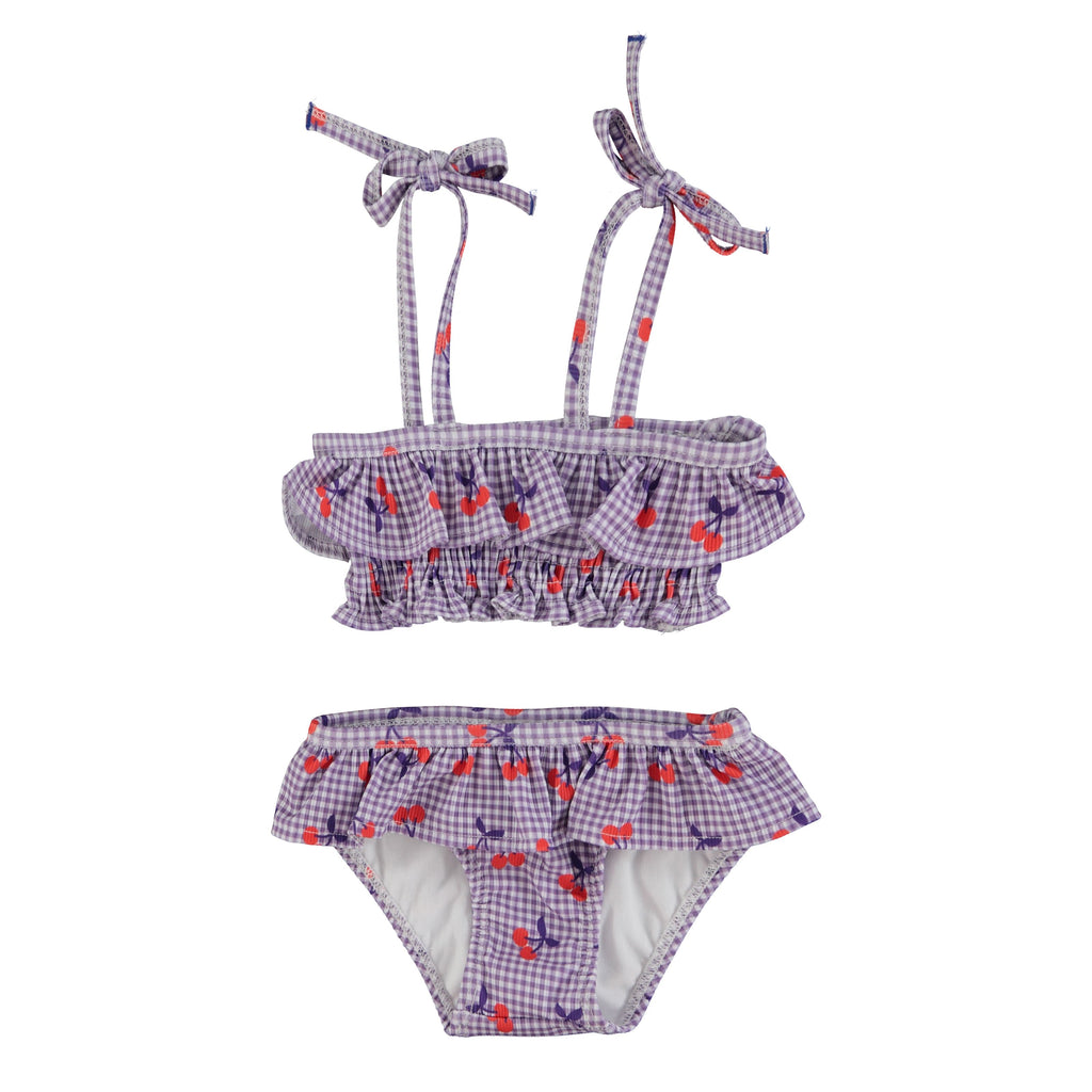 | Bikini with thin shoulder straps and ruffles in the chest and at the bottom. |