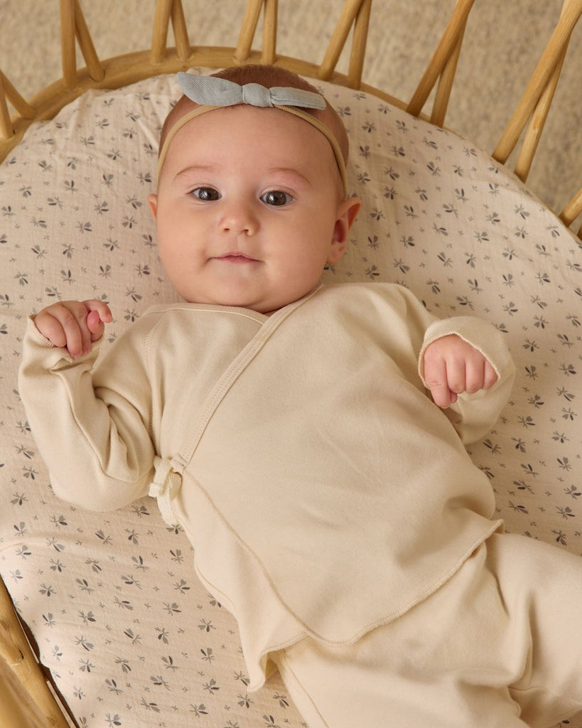 Wrap top + footed pant set made out of organic brushed jersey that ties on the outside for a comfortable fit, with matching footed drawstring pants.