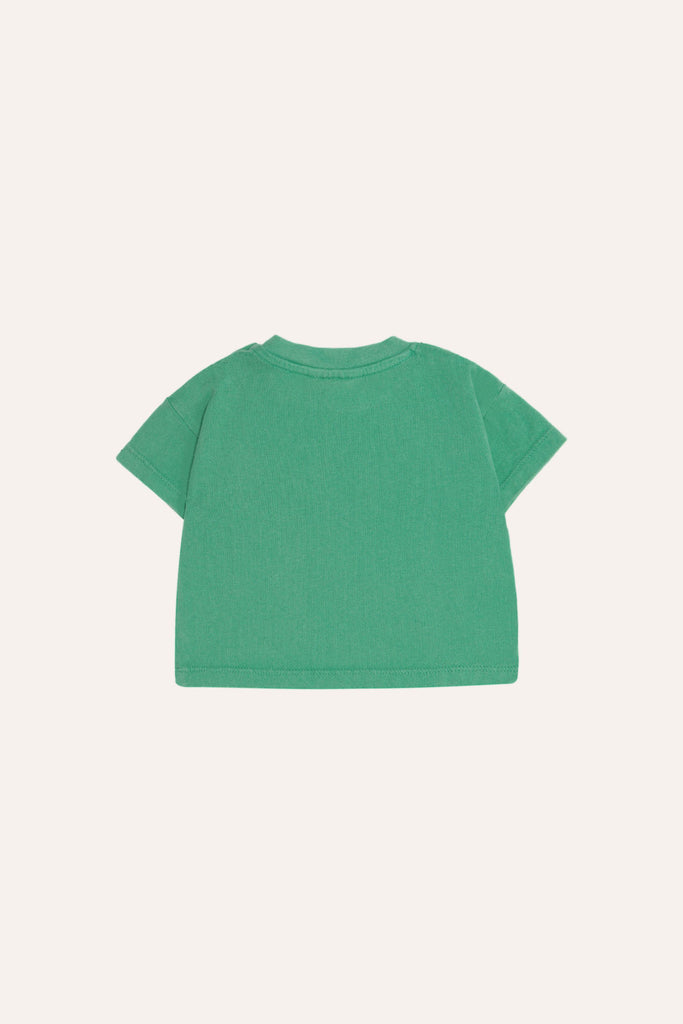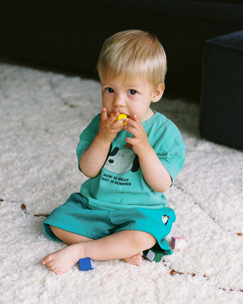 Short sleeve T-shirt in green featuring a playful print of a dog wearing a hat, Snap button on collar.