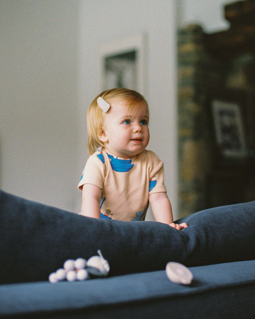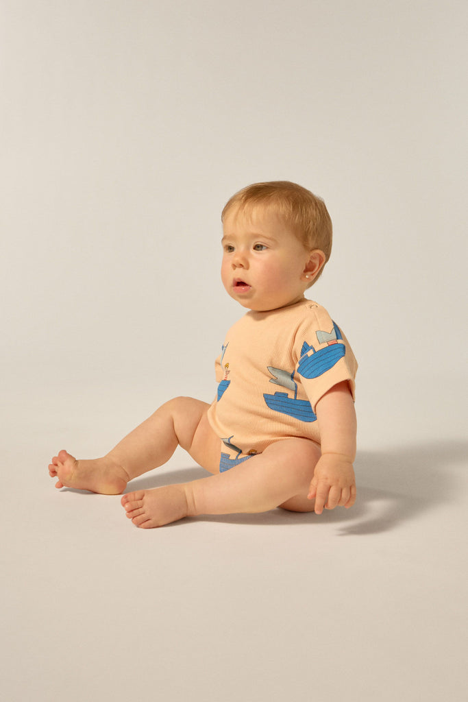 Short sleeve baby bodysuit with sailor print allover. Snap buttons between the legs for easy changing.