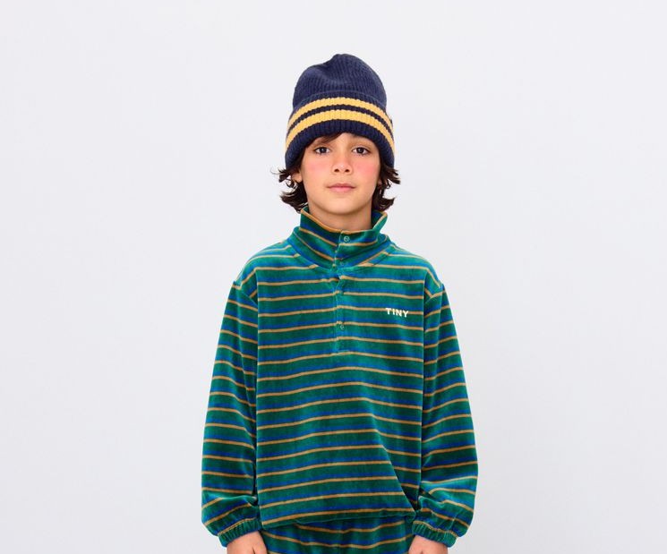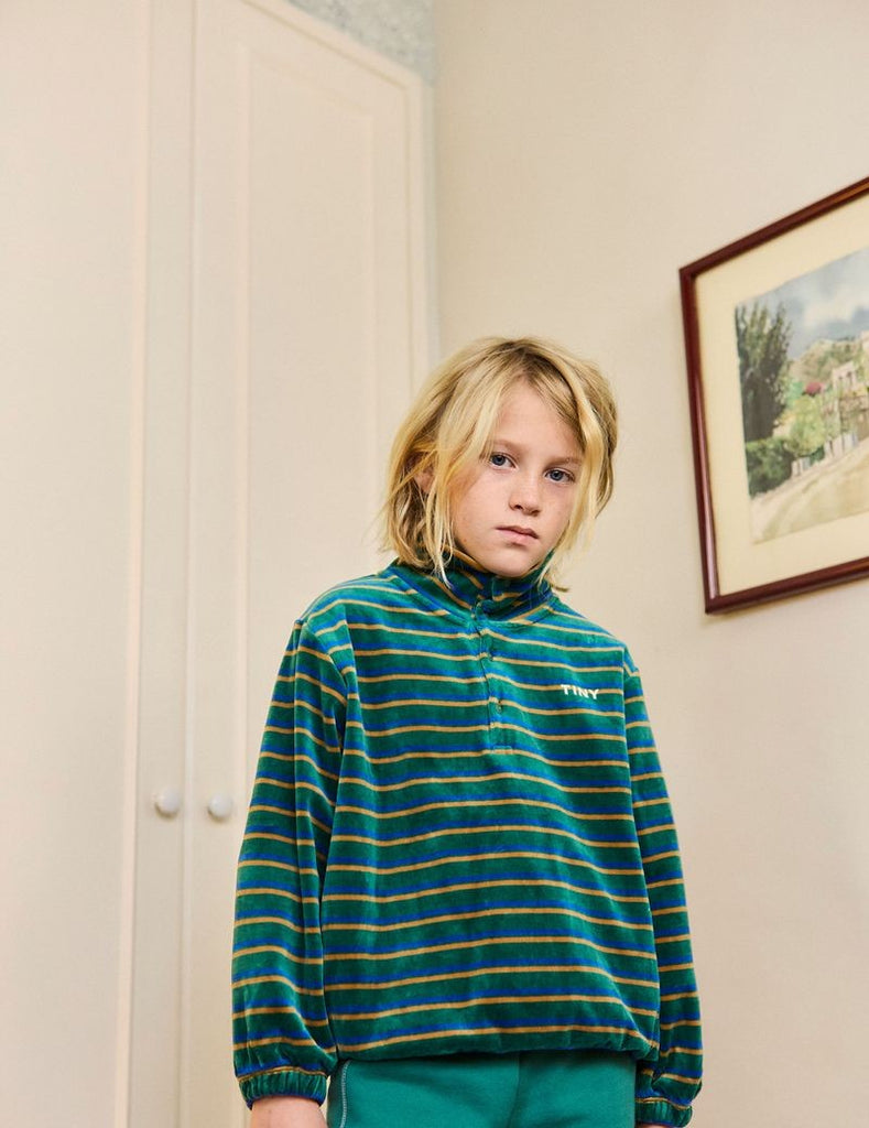 Stripes that never go out of style—this stripes sweatshirt is crafted from 100% organic cotton velour. It features a comfortable mockneck silhouette with elasticated hems and a half-front button opening. Perfect for casual outings or cozy days at home, this sweatshirt offers both style and comfort with a clear focus on quality.