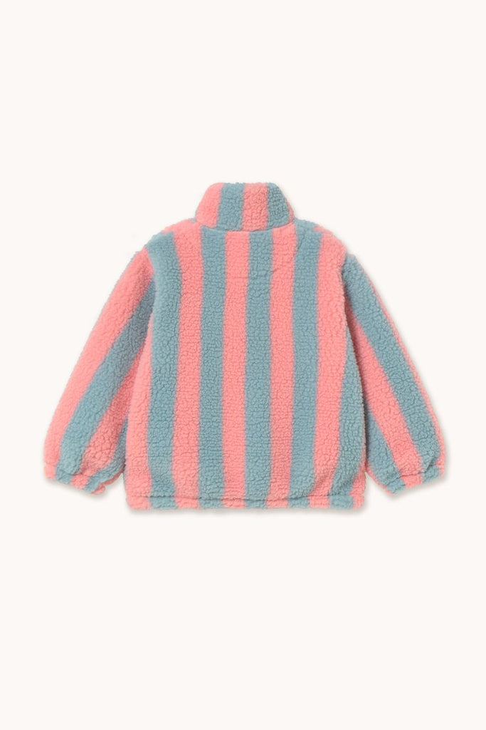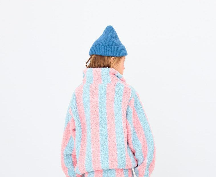 Featuring a timeless stripes pattern in bold colors, this sherpa jacket is perfect for staying warm in cold weather. It offers a comfortable silhouette with elasticated hems, a high neck, and a half-front snap opening for easy wear. Whether for a casual outing or a cozy day at home, it combines style and comfort with a clear focus on quality.