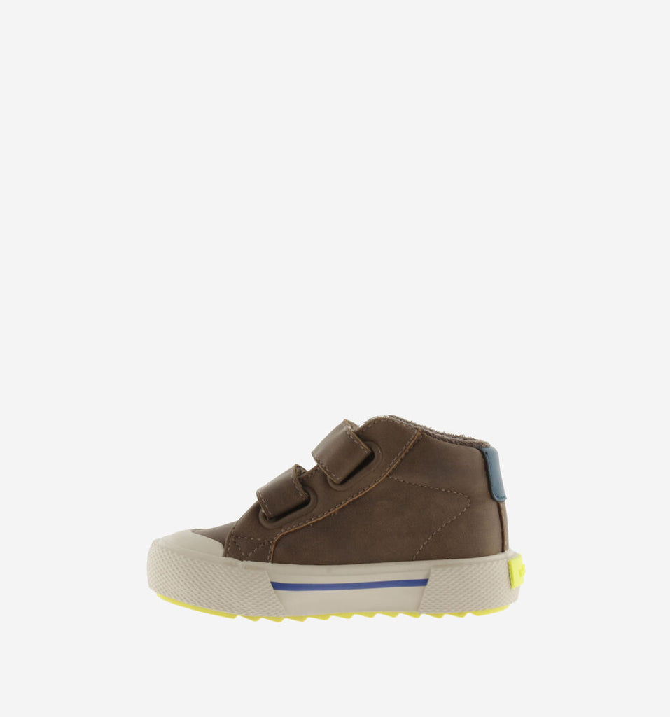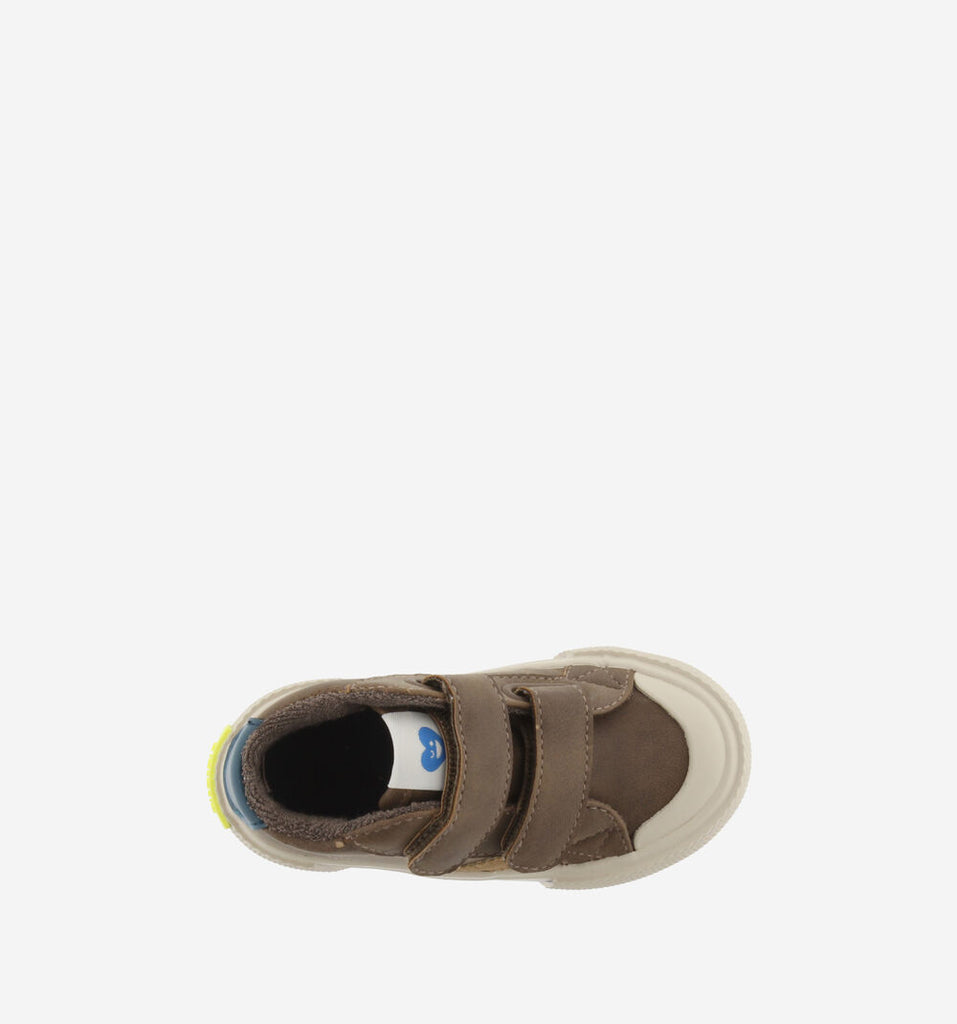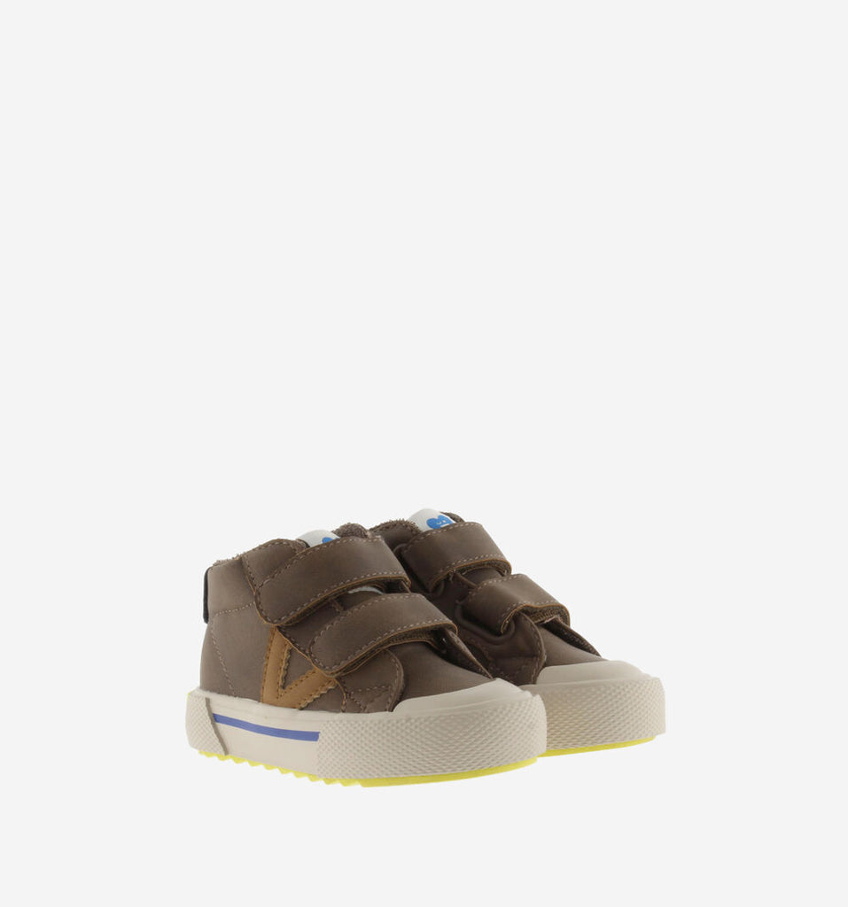 New mid boot sneakers for kids, with double velcro faux leather closure with Victoria side logo and white stitching.