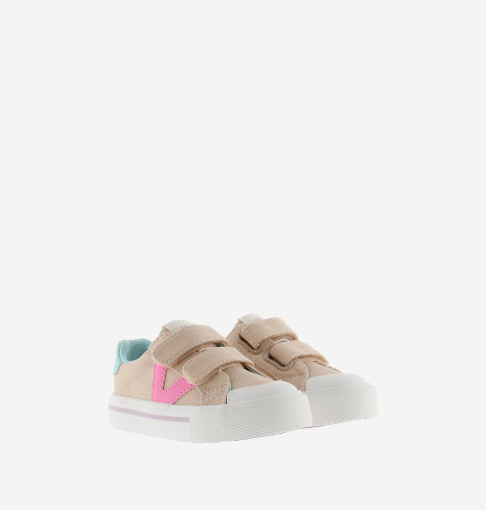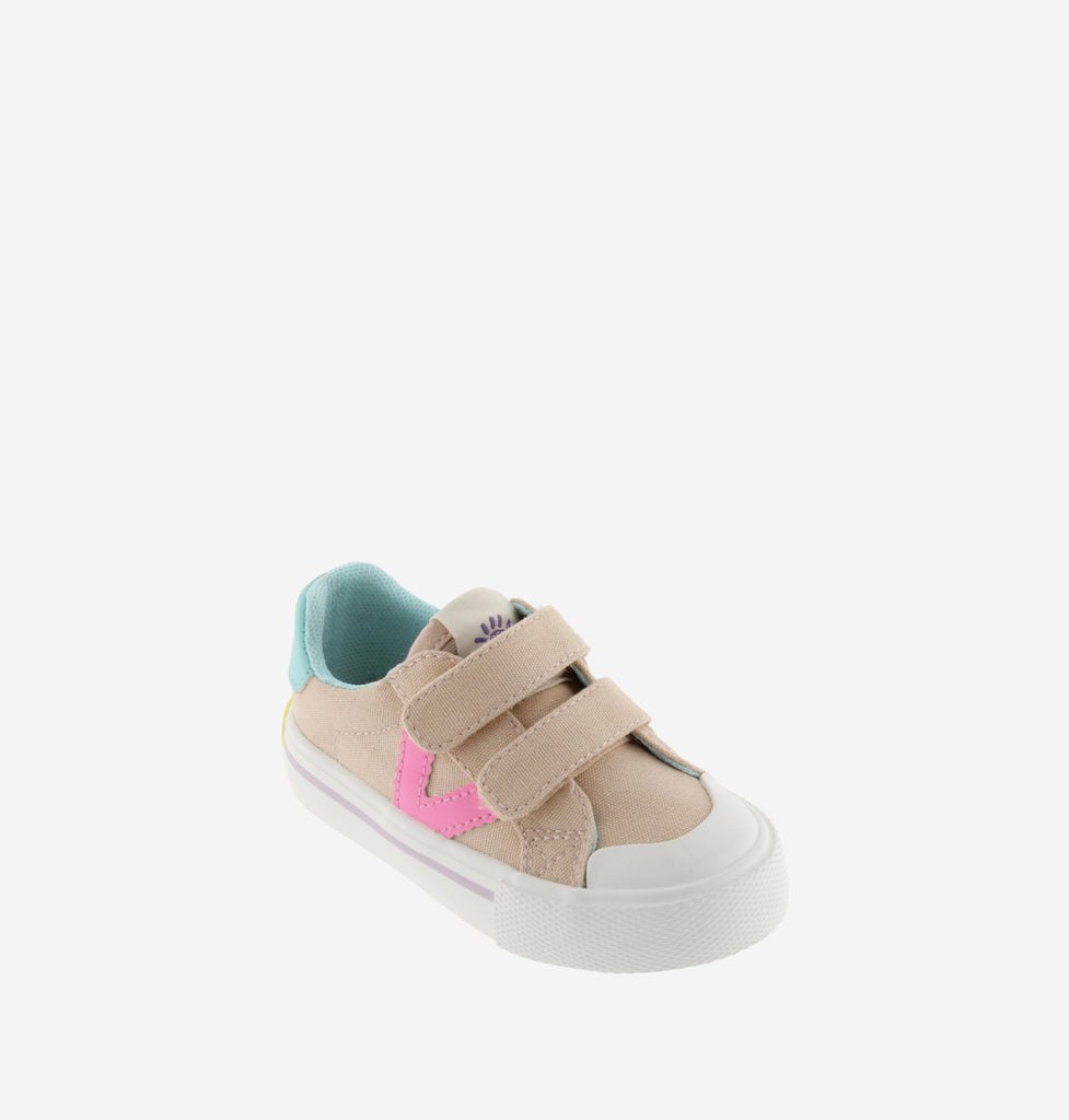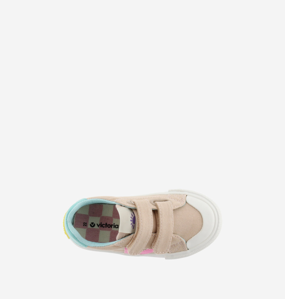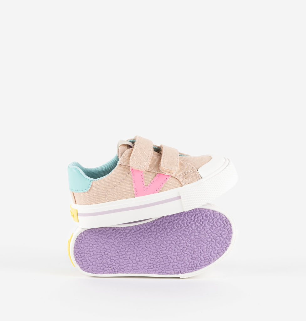Low-cut canvas sneakers. Its closure is by two adhesive straps, which facilitate fitting and promote its autonomy. Its rubber sole also has reinforcement on the toe, for greater resistance and durability. Victoria logo on the side and the back piece in contrasting fluorescent colors.