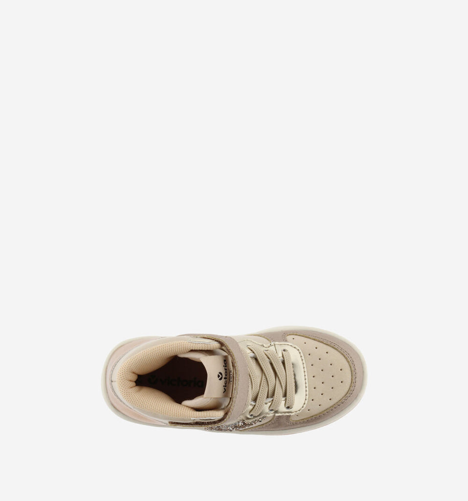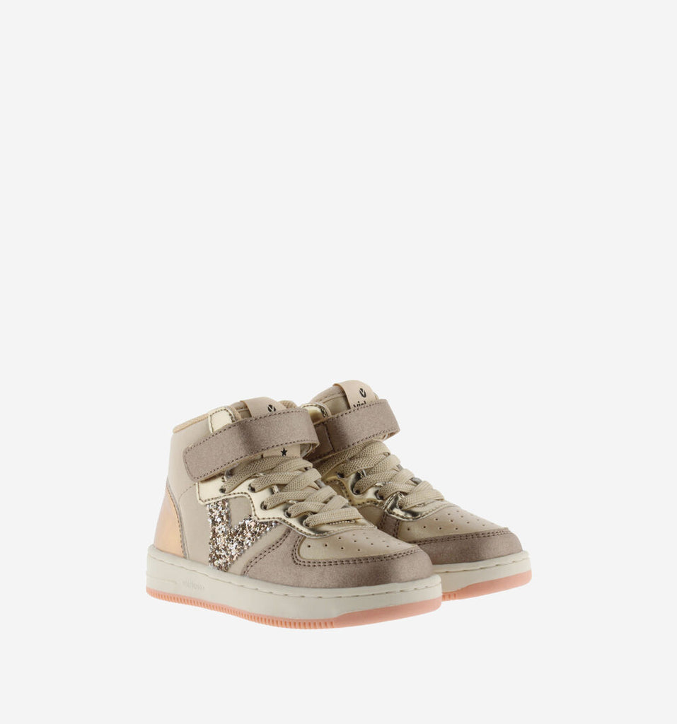 Metallic ankle boots with shiny finish for girls. Textured glitter detail in the V on the side and golden piece on the heel. Closure with elastic laces and adherent strip to favor the support of the foot and the autonomy of the little ones when putting on their shoes. Sole with non-slip skate in pastel shades.