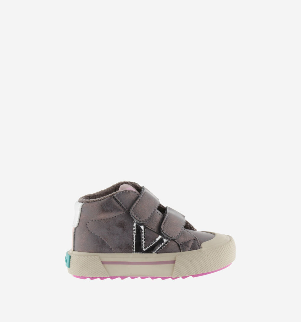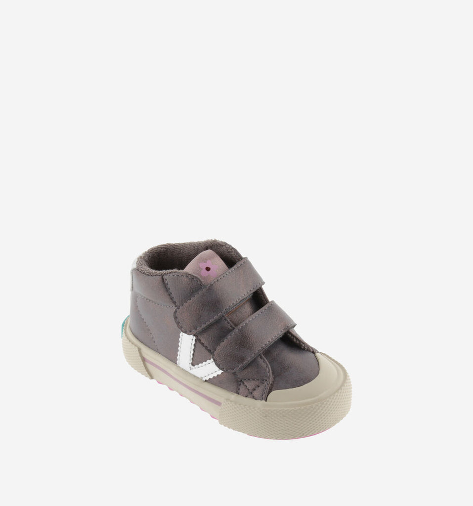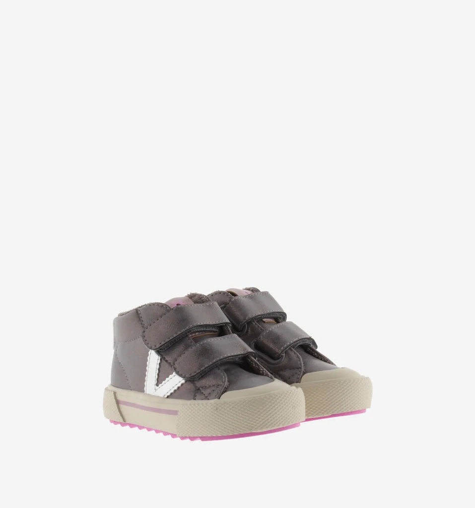 Metallic ankle boots for girls, crafted from leather-effect material with shiny details on the logo and at the rear. They feature a flower-shaped detail on the tongue label. The hook-and-loop closure ensures a comfortable fit and optimal foot support. The rubber sole includes reinforcement at the toe and a fluorescent non-slip tread, ensuring both safety and style. Additionally, they come with a high-density printed insole for exceptional comfort. Perfect for keeping up with the active pace of little ones in style and comfort.