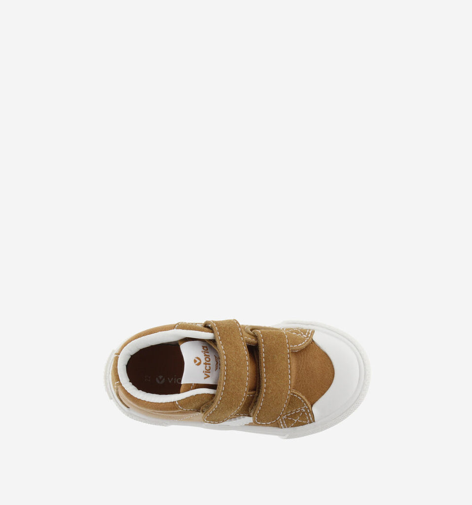 New mid boot sneakers for kids, with double velcro faux leather closure with Victoria side logo and white stitching.
