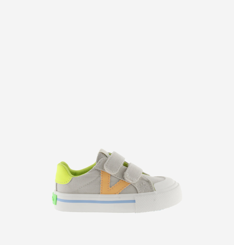 Low-cut canvas sneakers. Its closure is by two adhesive straps, which facilitate fitting and promote its autonomy. Its rubber sole also has reinforcement on the toe, for greater resistance and durability. Victoria logo on the side and the back piece in contrasting fluorescent colors.